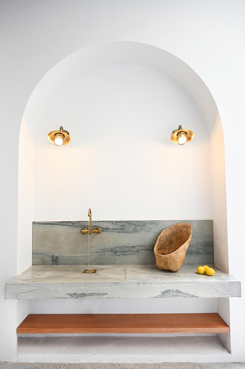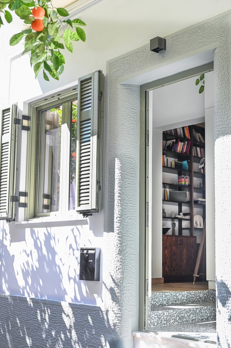 Η κάτοψη αναδιαμορφώνεται, με τη μεταφορά του λουτρού από την κεντροβαρική του θέση. Χώροι ενοποιούνται ώστε να προκύψει ένα άνετο, διαμπερές καθιστικό με τραπεζαρία που ανοίγεται προς την αυλή.