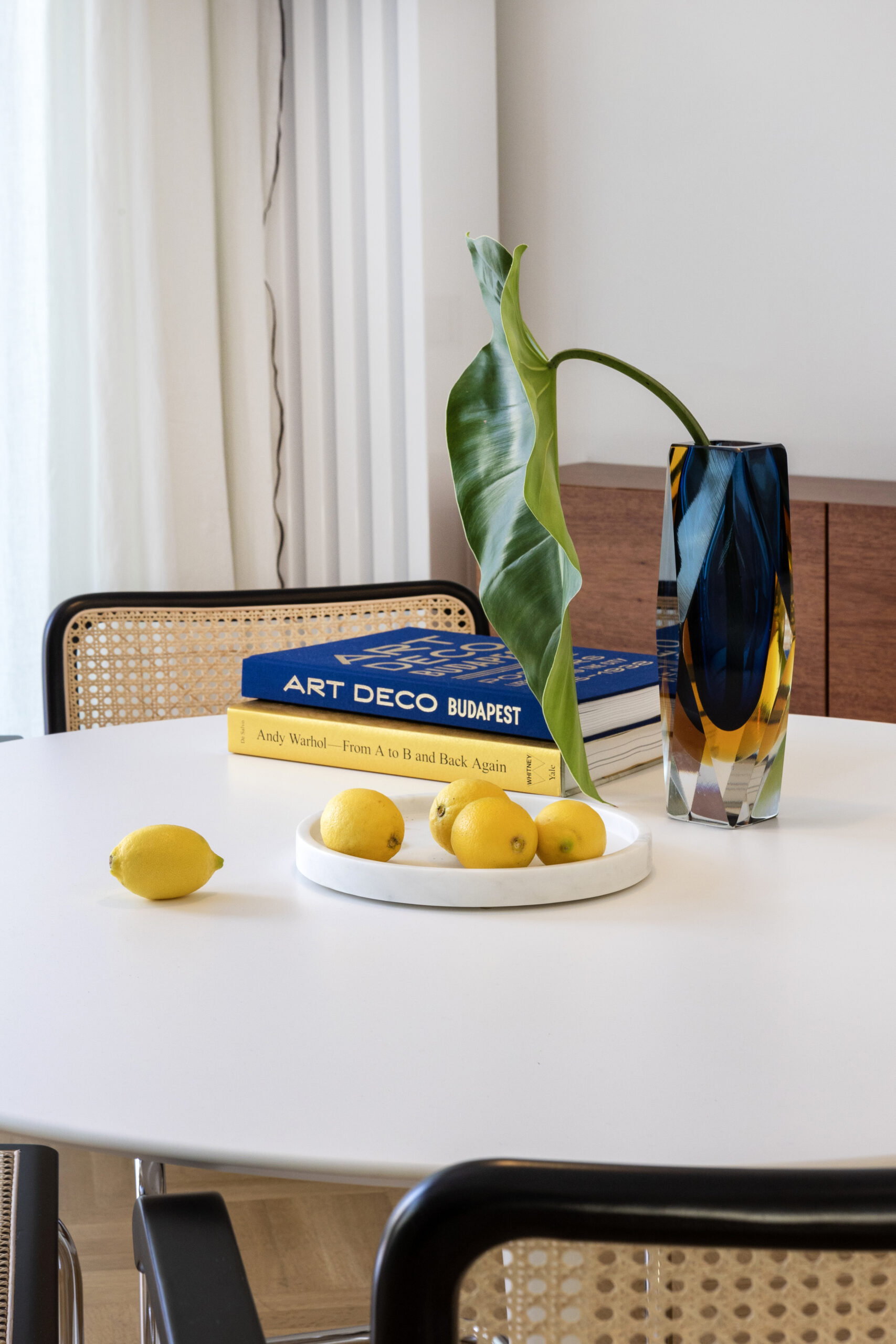Τρεις τύποι μαρμάρου, Αλιβερίου, Τήνου και Αφιόν, χρησιμοποιήθηκαν για να αναδείξουν στοιχεία του εσωτερικού χώρου, όπως το νέο τζάκι, τις ελεύθερες κολώνες, τη νησίδα της κουζίνας και τον μασίφ νιπτήρα του μπάνιου.