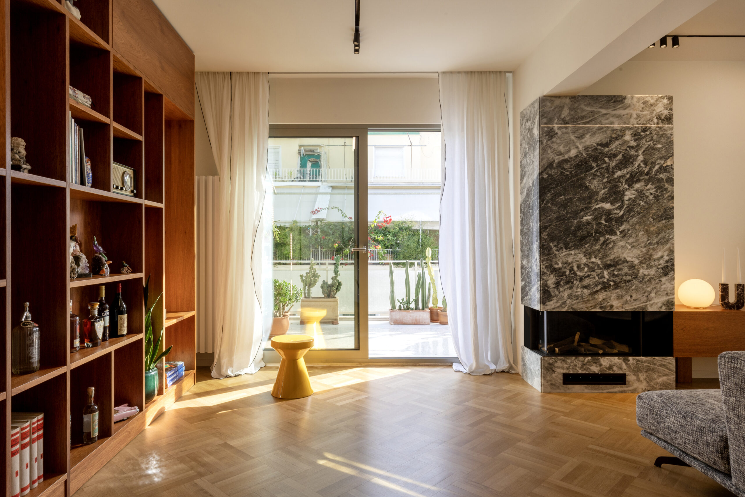 Το νιαγκόν, ένα χαρακτηριστικό φινίρισμα ξύλου των αθηναϊκών εσωτερικών χώρων της δεκαετίας του ’50, ξαναχρησιμοποιήθηκε σε νέες ιδιοκατασκευές, όπως η μεγάλη βιβλιοθήκη στην είσοδο, τα βοηθητικά επίτοιχα έπιπλα του καθιστικού και στο υπνοδωμάτιο.