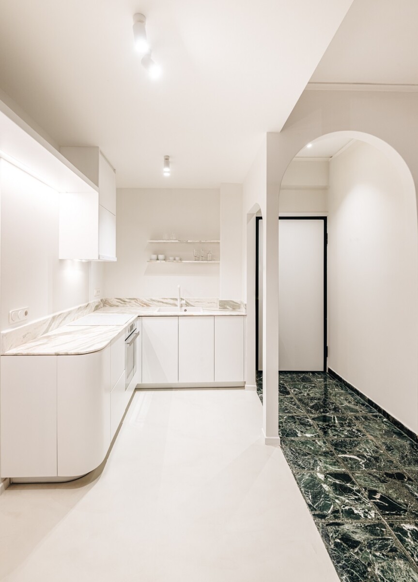 Η κουζίνα της κατοικίας, επενδύθηκε με μάρμαρο, σε πράσινες και ροζ αποχρώσεις, αρμονικές με το μωσαϊκό από μάρμαρο Τήνου που δεσπόζει στον χώρο.
