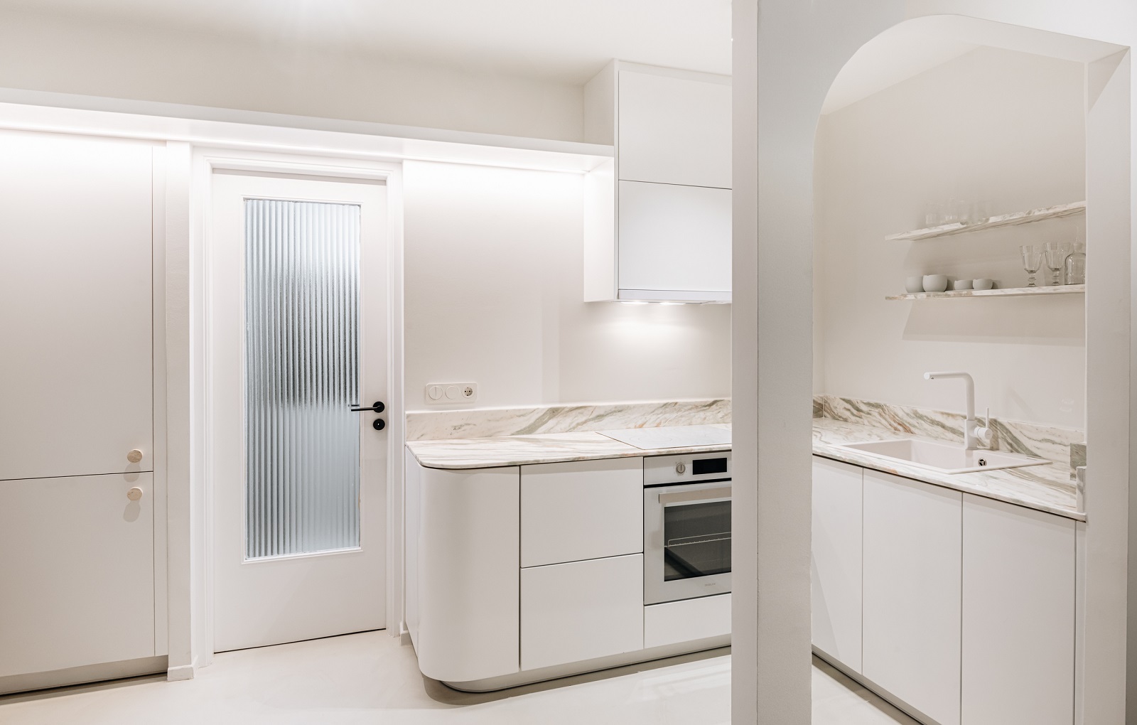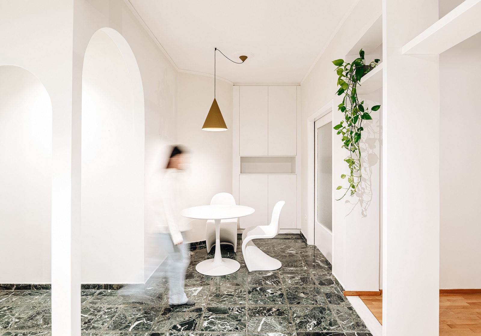 Η κάτοψη αναδιαμορφώνεται με τη λειτουργική σύνδεση κουζίνας, τραπεζαρία και καθιστικού. Τα αυστηρά όρια των τοίχων αντικαθίστανται από ένα διαχωριστικό στοιχείο που διατρέχει το εσωτερικό του διαμερίσματος και διευκολύνει τη λειτουργική συνέργεια των δύο χώρων. Με τον τρόπο αυτόν, υπάρχει μεγαλύτερη διείσδυση φυσικού φωτός στο προηγουμένως αυστηρά οριοθετημένο και σκοτεινό διαμέρισμα.