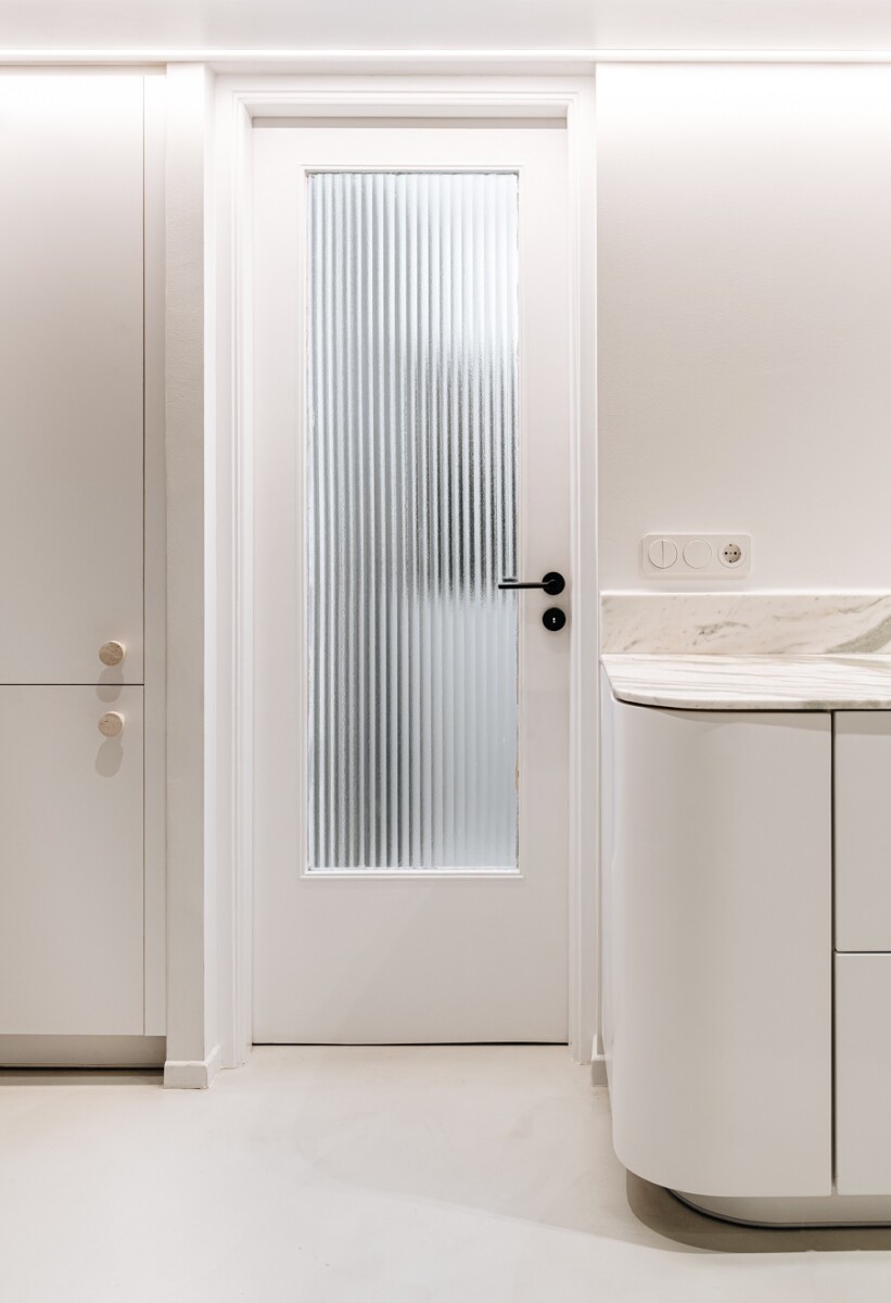 Οι αρχικές εσωτερικές πόρτες με τα υαλοπετάσματα συντηρήθηκαν και επαναχρησιμοποιήθηκαν.