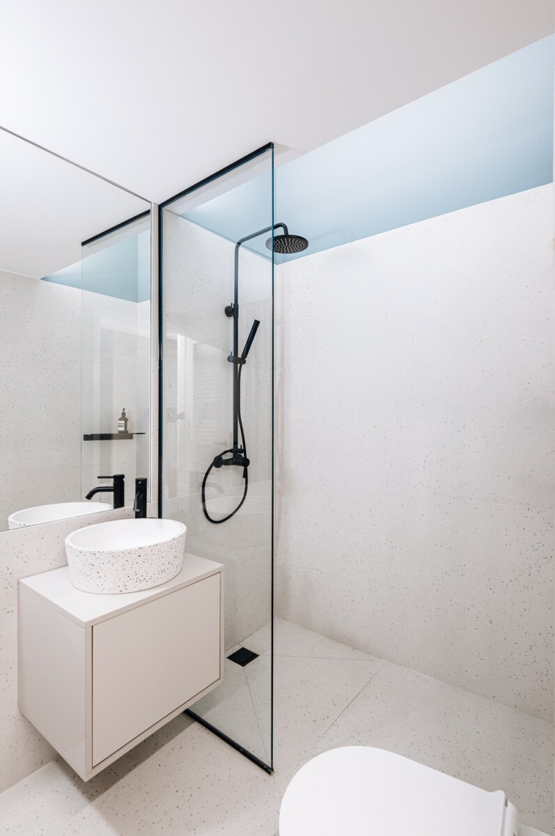 Επιλέχθηκαν λευκές αποχρώσεις σαν καμβάς μιας χρωματικής παλέτας αποχρώσεων του μπλε, του πράσινου και του ροζ. Μάρμαρο και ξύλο, υλικά σκληρά και μαλακά εναλλάσσονται στο χώρο.