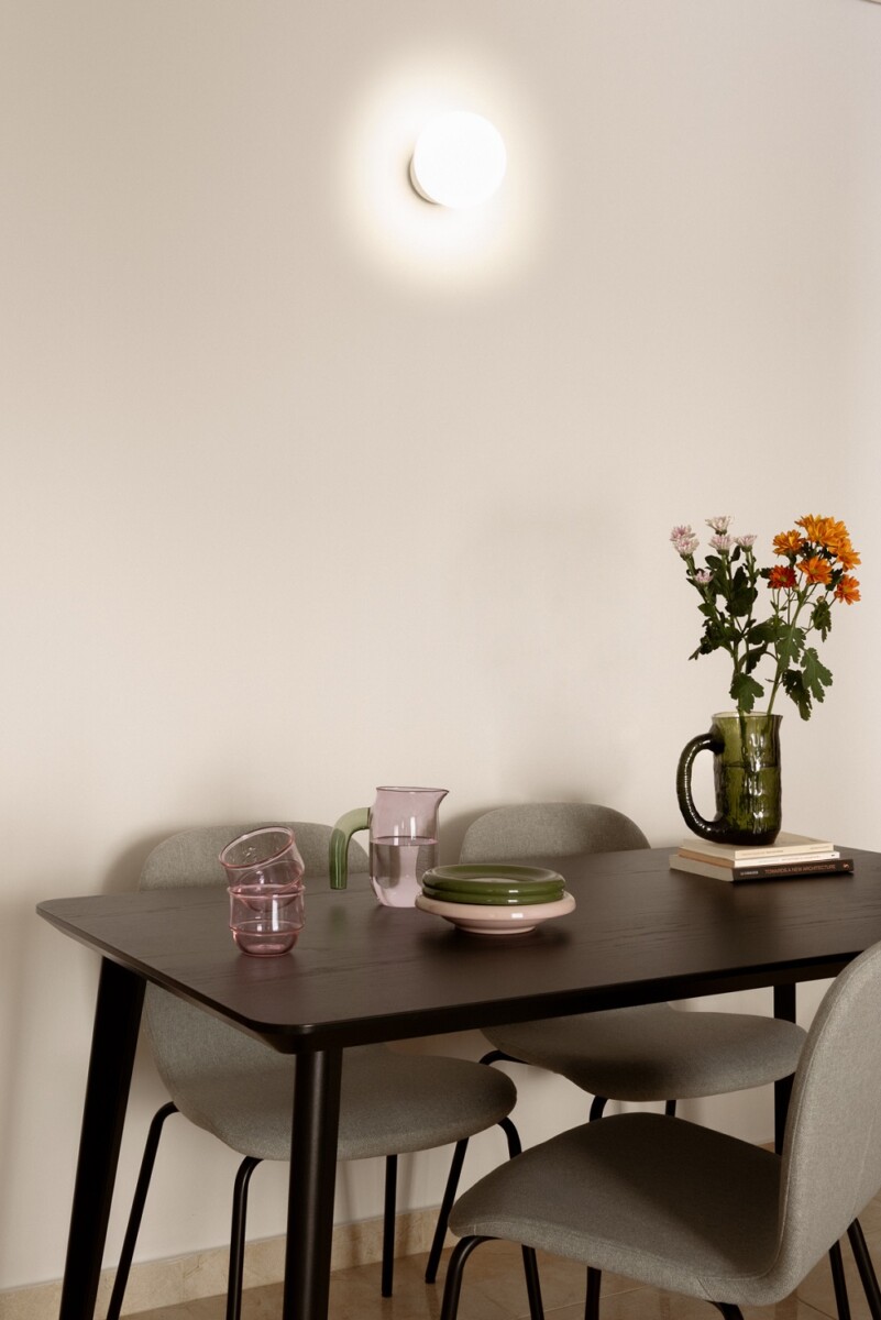 Στη θέση που αρχικά υπήρχε ένα ογκώδες και δύσχρηστο έπιπλο μπουφέ τοποθετήθηκε ένα compact dining τραπέζι που μπορεί κατά περίπτωση να χρησιμοποιηθεί και σαν επιφάνεια εργασίας με laptop. Μία στρογγυλή minimal απλίκα τοίχου σηματοδοτεί το χώρο του φαγητού.