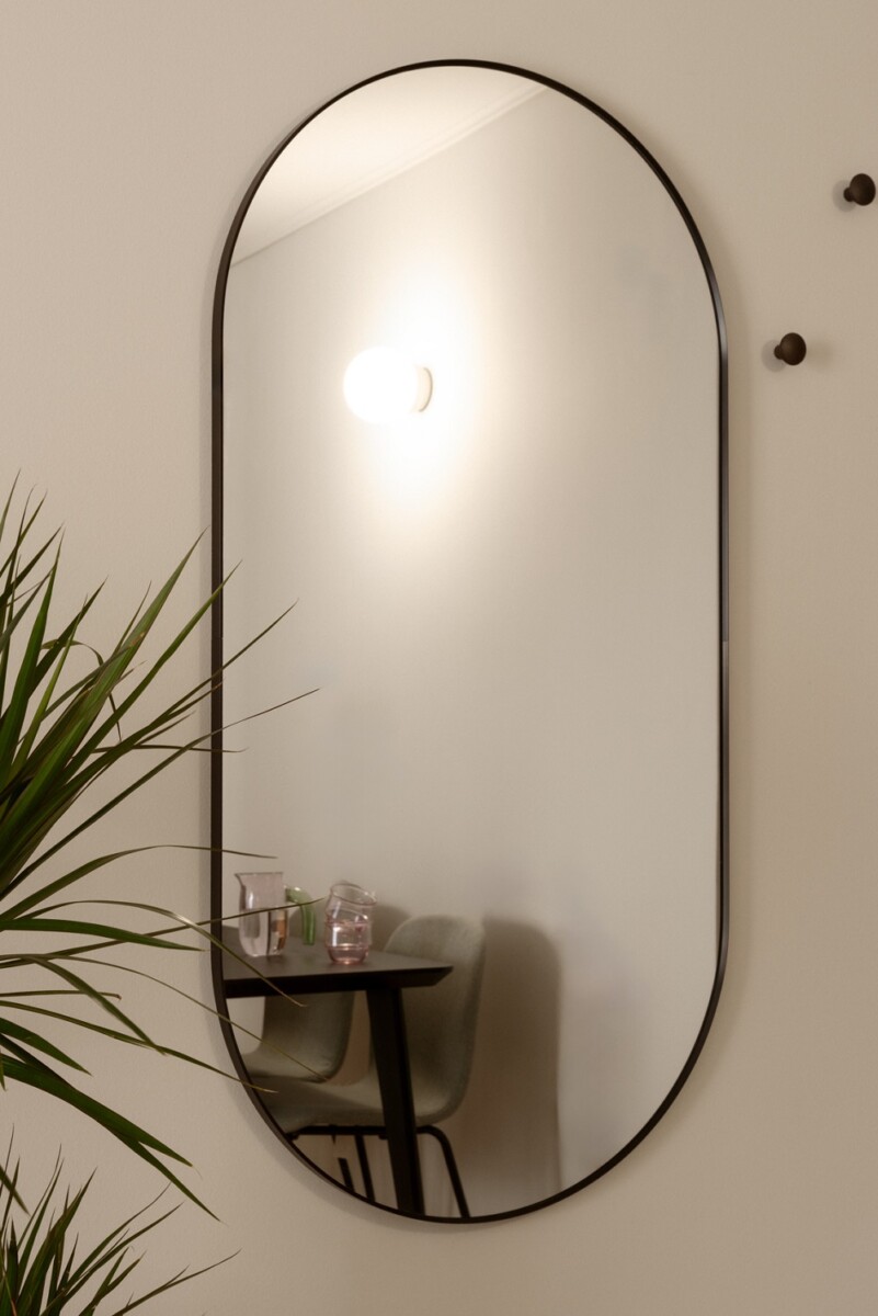Στην είσοδο, που λειτουργεί σαν κατώφλι, προτάθηκε ένα κάθισμα με ολόσωμο καθρέφτη και προστέθηκαν κάποια στρογγυλά πόμολα στον τοίχο.