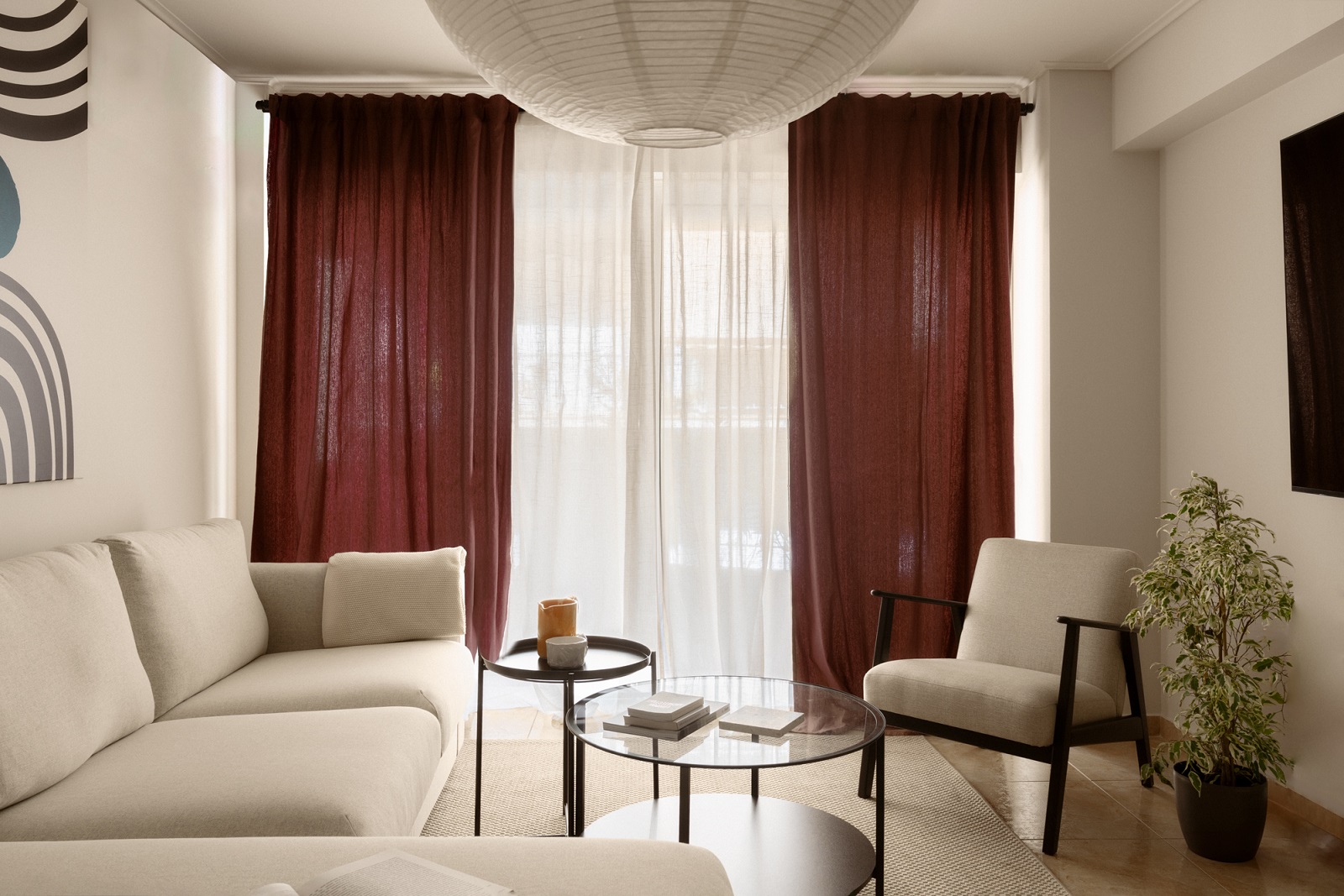 Οι κουρτίνες έπαιξαν σημαντικό ρόλο στον ορισμό της ταυτότητας των χώρων καθώς υπήρξε η επιθυμία το κάθε υπνοδωμάτιο να διαθέτει το δικό του διακριτό χαρακτήρα. Οι κουρτίνες λειτουργούν σαν φίλτρο διαφορετικών διαβαθμίσεων από το αστικό περιβάλλον – γι’ αυτό και τοποθετήθηκε σε κάθε δωμάτιο ένα ζεύγος κουρτινών συσκότισης και ένα διαφανές.