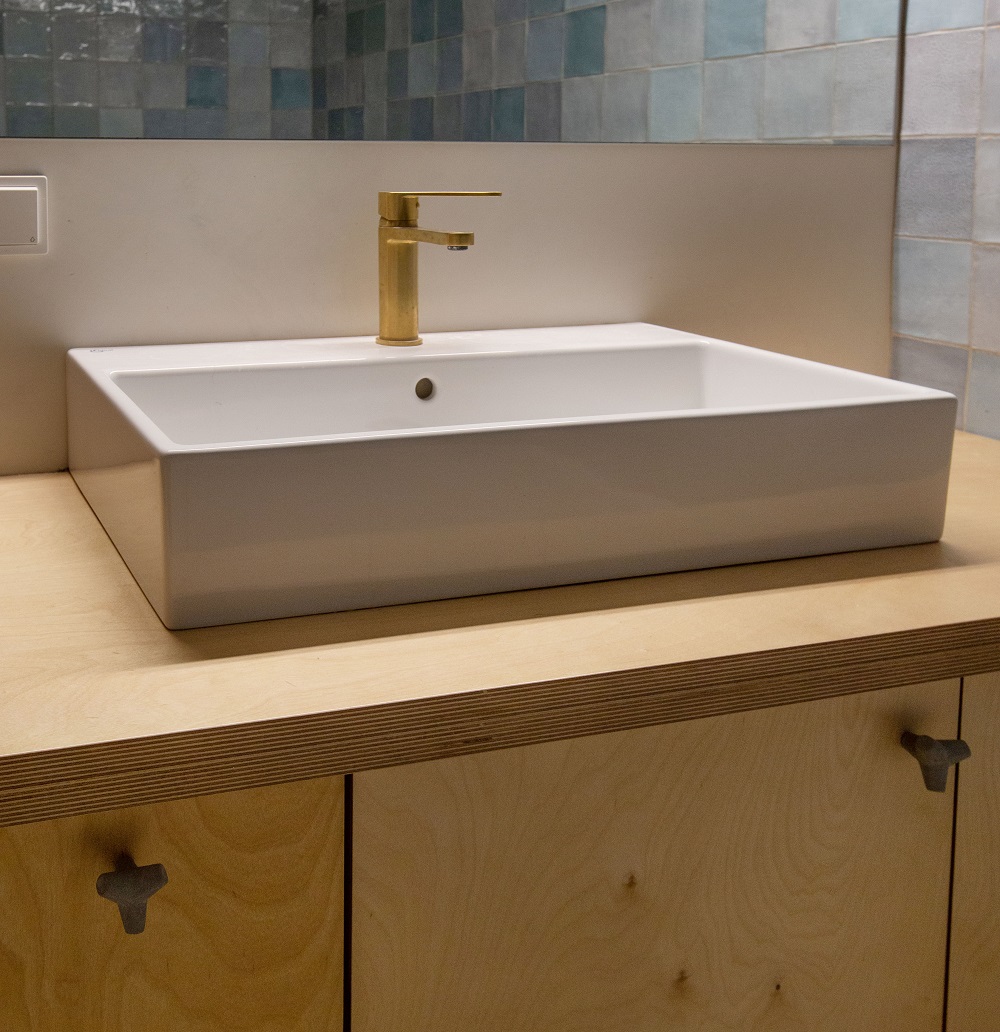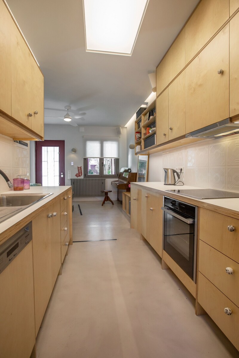 Η κουζίνα, τοποθετημένη στο κέντρο, λειτουργεί ως κόμβος και χώρος μετάβασης. Συμμετέχει σε ένα χωρικό παιχνίδι πολλαπλών ρόλων: αποτελεί πέρασμα ανάμεσα στους κοινόχρηστους χώρους, ενθαρρύνει τον επιμερισμό της καθημερινότητας, διαχωρίζει τις ζώνες ώστε κάθε ηλικιακή ομάδα να απολαμβάνει ιδιωτικότητα χωρίς να χάνει την πρόσβαση στην «καρδιά» του σπιτιού, και ταυτόχρονα εξοικονομεί χώρο.