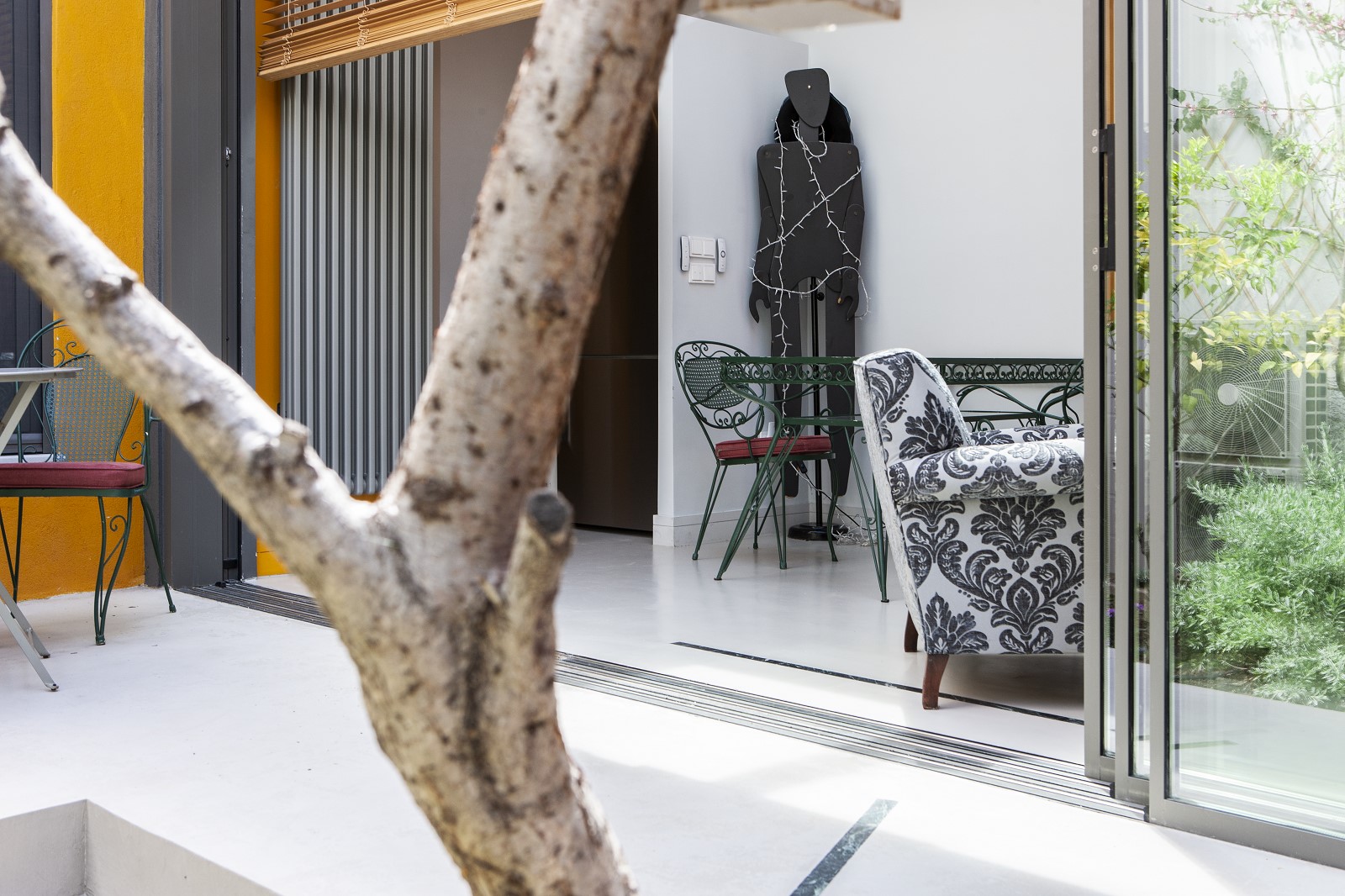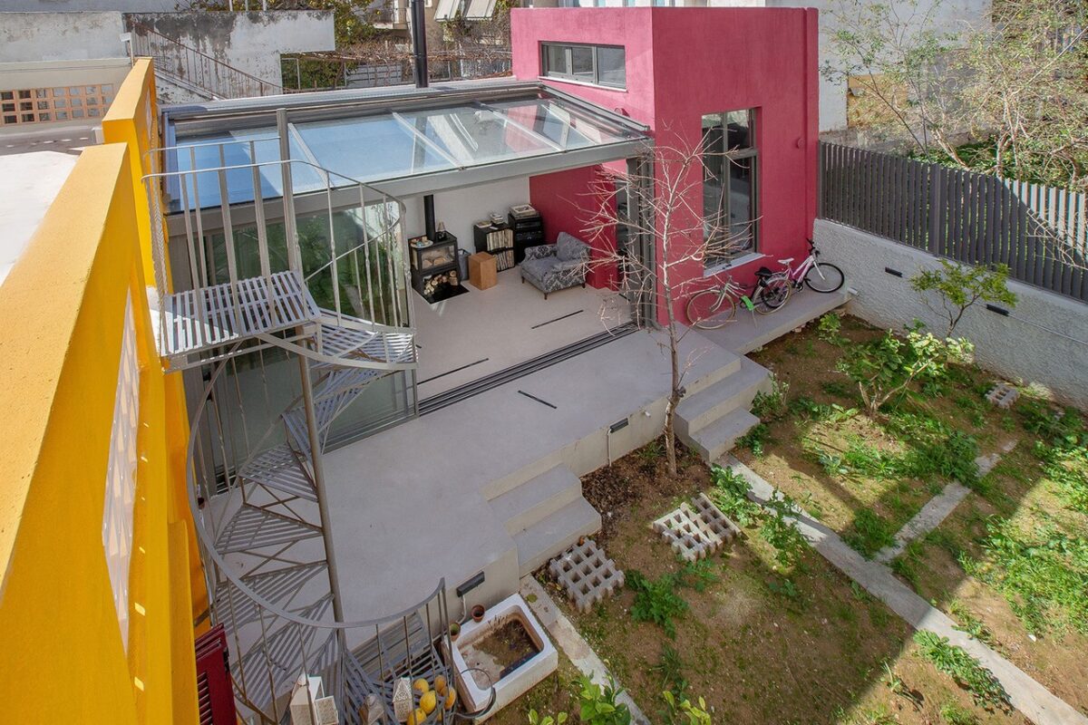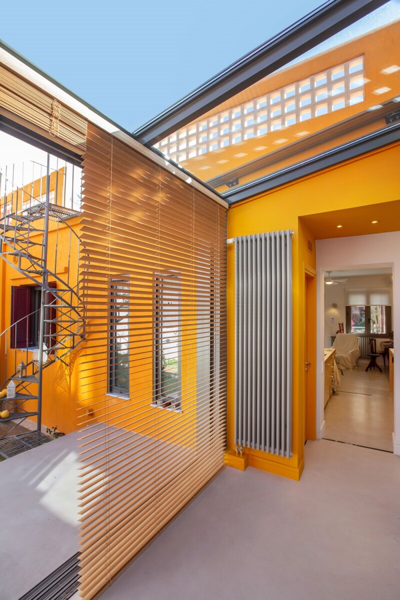 Στην πίσω αυλή αναπτύσσεται ένας άλλος κόσμος: ένα patio γεμάτο εσωτερικότητα, φως και έντονα χρώματα. Οι διαφορετικοί χρωματισμοί των δύο όγκων τονίζουν τη διαφάνεια του αιθρίου και αντλούν έμπνευση από τη μεξικανική αρχιτεκτονική, ειδικότερα από τον Luis Barragán.