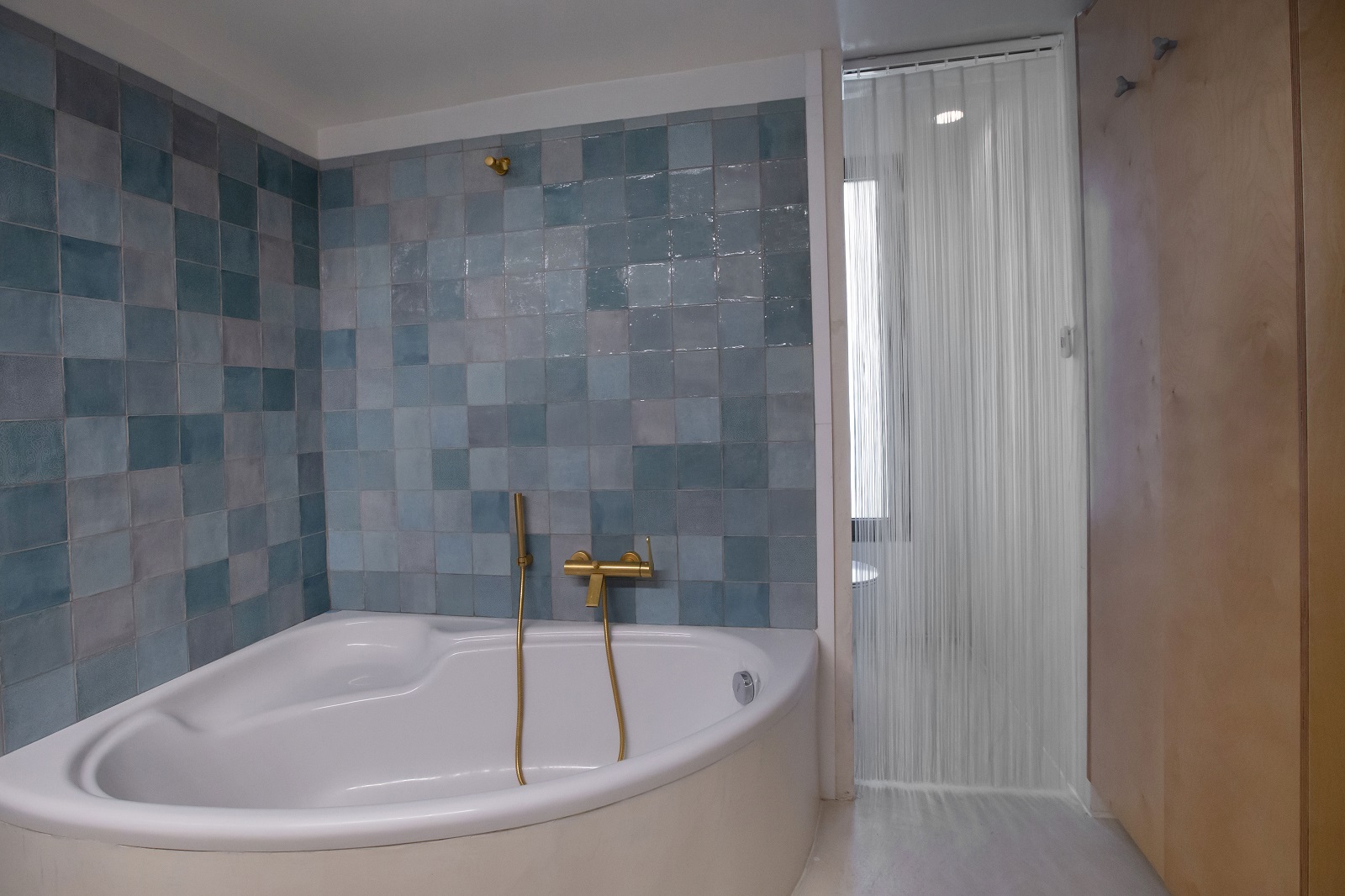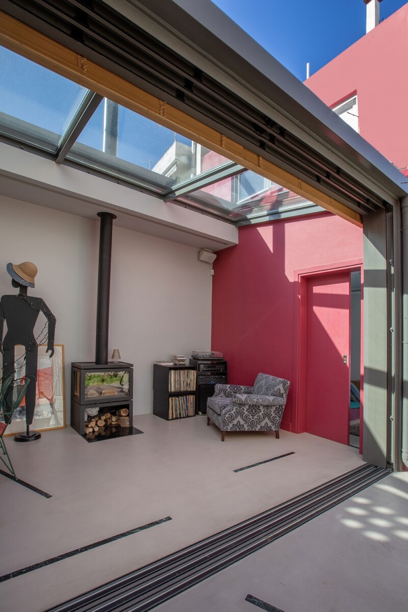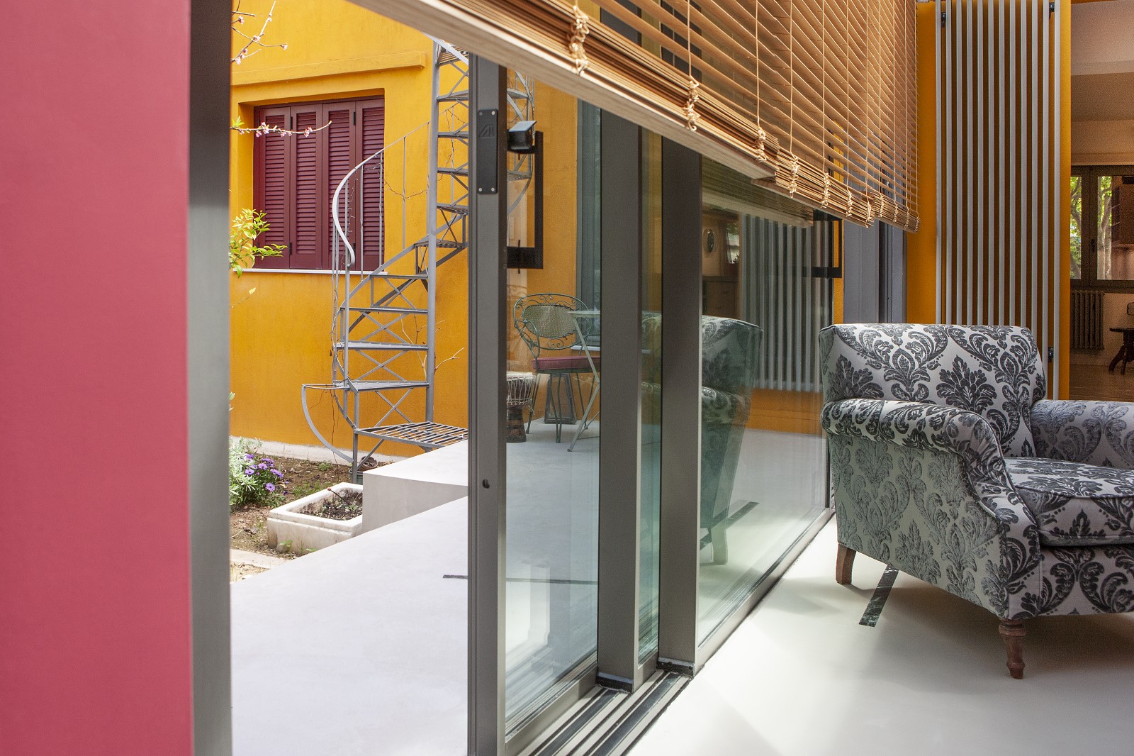 Στην πίσω αυλή αναπτύσσεται ένας άλλος κόσμος: ένα patio γεμάτο εσωτερικότητα, φως και έντονα χρώματα. Οι διαφορετικοί χρωματισμοί των δύο όγκων τονίζουν τη διαφάνεια του αιθρίου και αντλούν έμπνευση από τη μεξικανική αρχιτεκτονική, ειδικότερα από τον Luis Barragán.