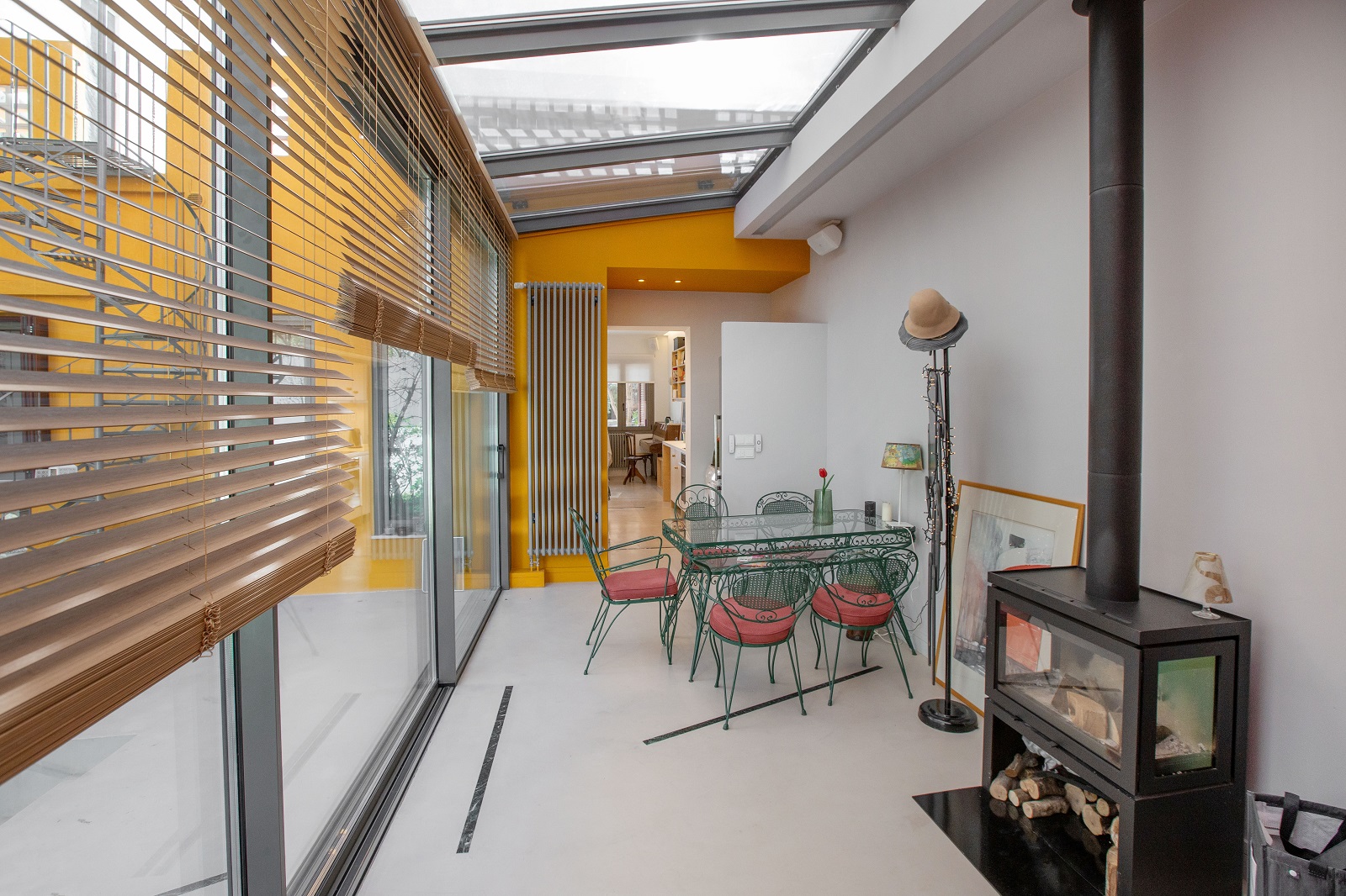 Η γοητεία της πίσω αυλής ήταν έντονη και η διατήρησή της αποτέλεσε βασική επιδίωξη. Η σύνδεση των δύο κτισμάτων επιτεύχθηκε μέσω ενός αιθρίου· ενός ημιδιάφανου χώρου που διατηρεί, εν μέρει, τα χαρακτηριστικά του υπαίθριου, λειτουργεί ως βιώσιμος χώρος και πέρασμα, και για έξι μήνες τον χρόνο γίνεται οργανικό τμήμα της αυλής. Το μικρό κτίσμα υπερυψώθηκε και απέκτησε ένα πατάρι-γραφείο. Το αποτέλεσμα είναι μια ενιαία κατοικία συνολικού εμβαδού 102 τ.μ. Η διάταξη σε σχήμα Γ αποτέλεσε πρόκληση για ένα σπίτι αυτού του μεγέθους.