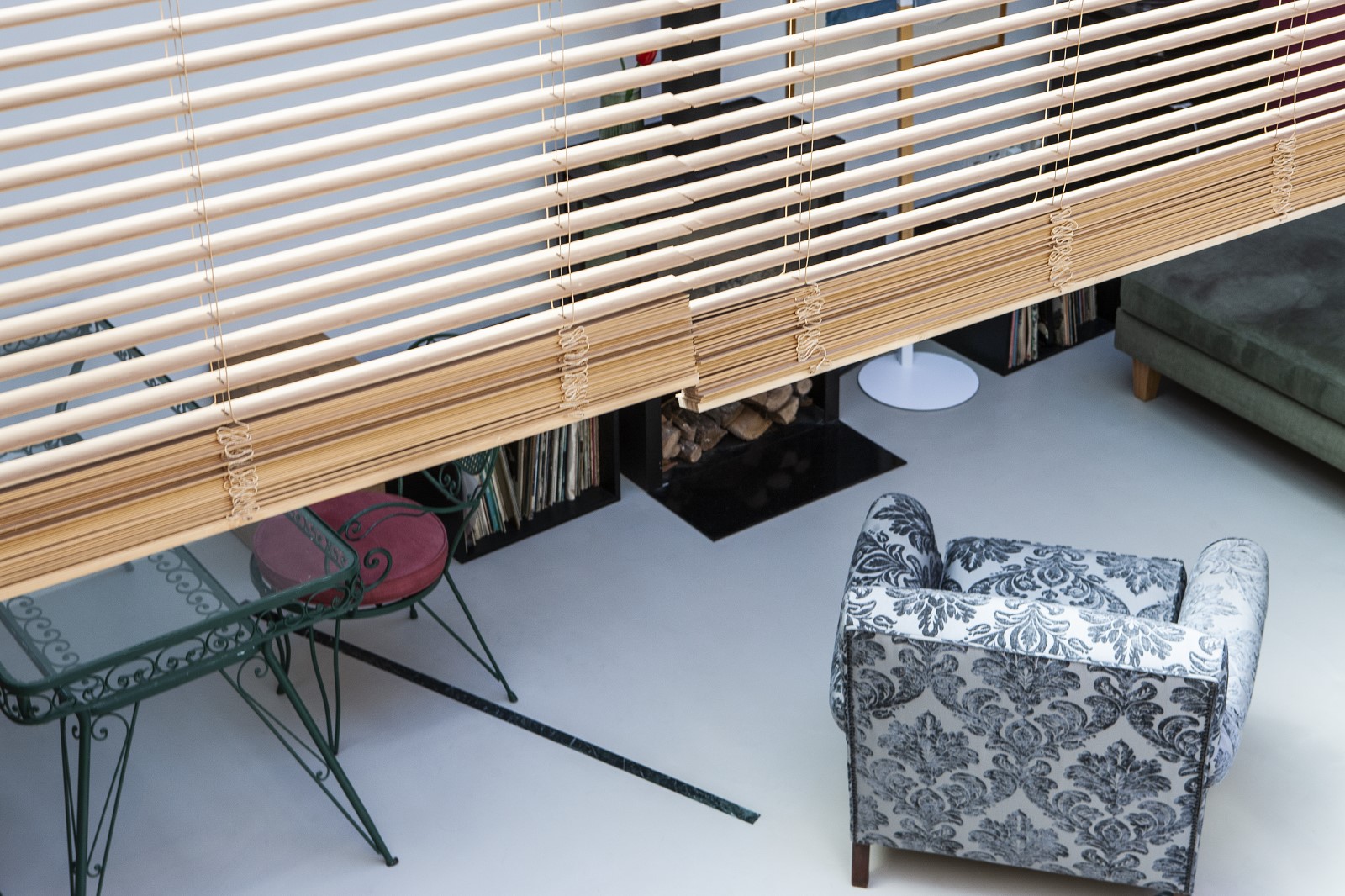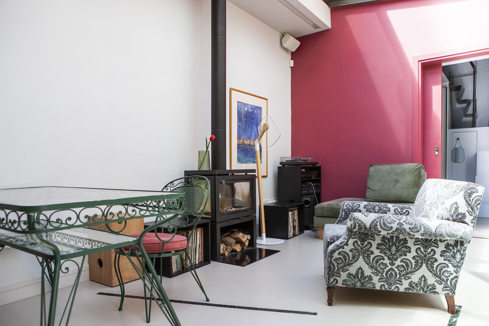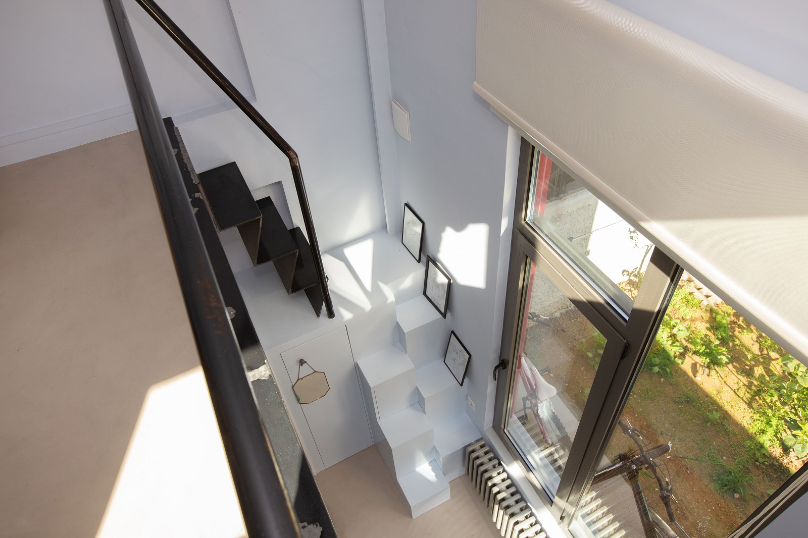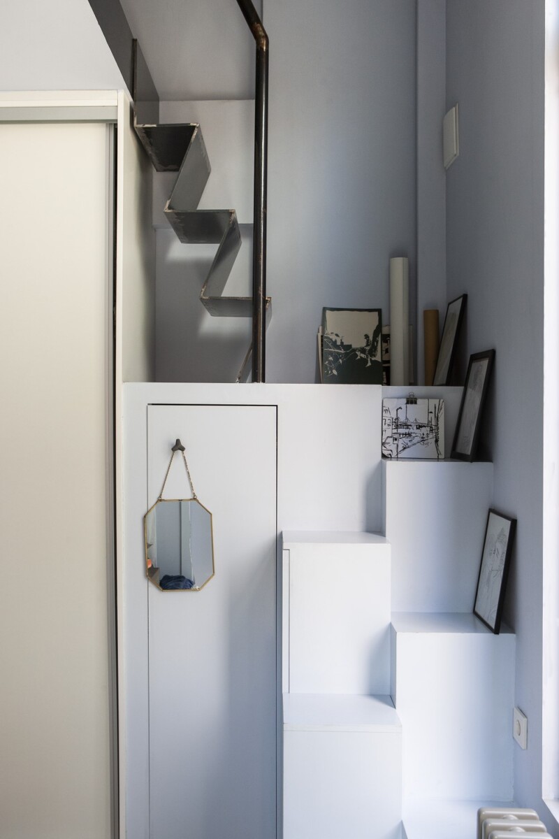 Στο υπνοδωμάτιο των ενηλίκων, μια σκάλα-γλυπτό οδηγεί στο πατάρι: μια μεικτή κατασκευή όπου το πρώτο τμήμα αποτελεί ξύλινο βαμμένο όγκο στο χρώμα του τοίχου, ενώ το δεύτερο συντίθεται από μεταλλικά σκαλοπάτια αναδιπλούμενης λαμαρίνας στο φυσικό της χρώμα.