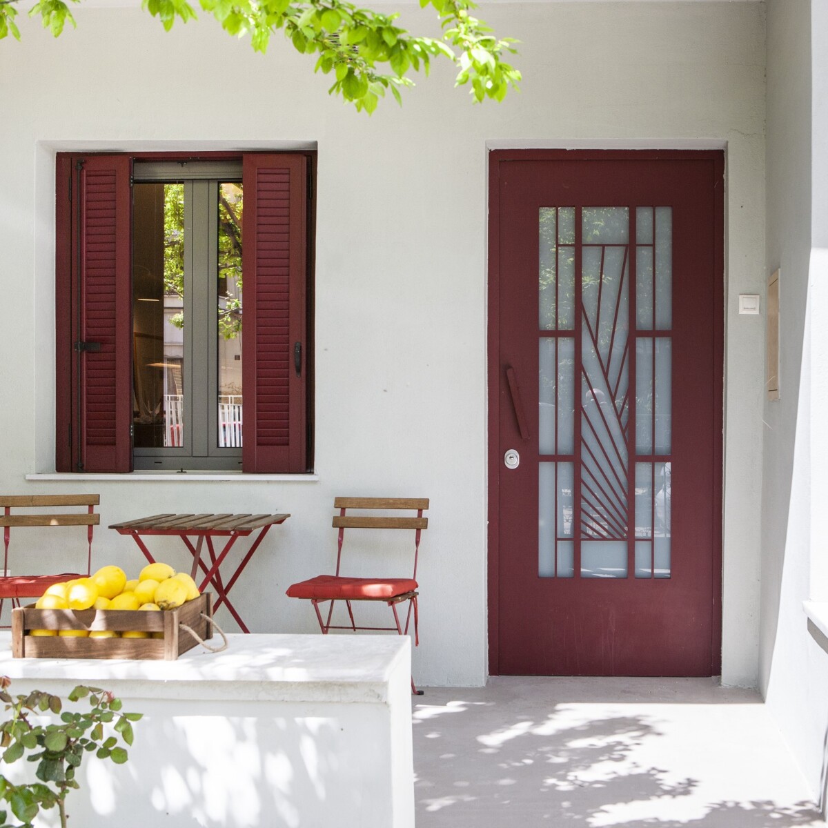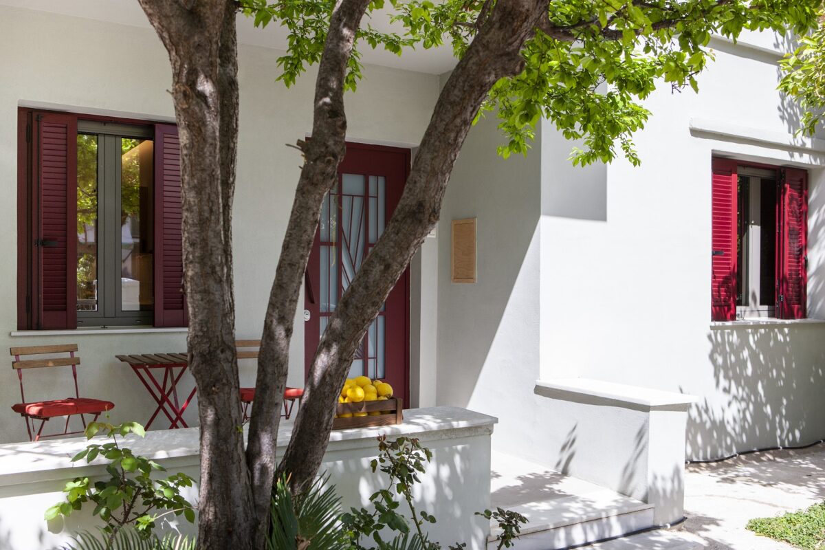 Στην μπροστινή αυλή, σε επαφή με τον δρόμο, διατηρήθηκε η μορφή της λαϊκής κατοικίας του ’60. Αντί για συμπαγές στηθαίο, τοποθετήθηκαν κλώστρα ως αναφορά στην εποχή, ενώ η εξώθυρα σχεδιάστηκε εμπνευσμένη από τα γεωμετρικά σχέδια θυρών της περιόδου.