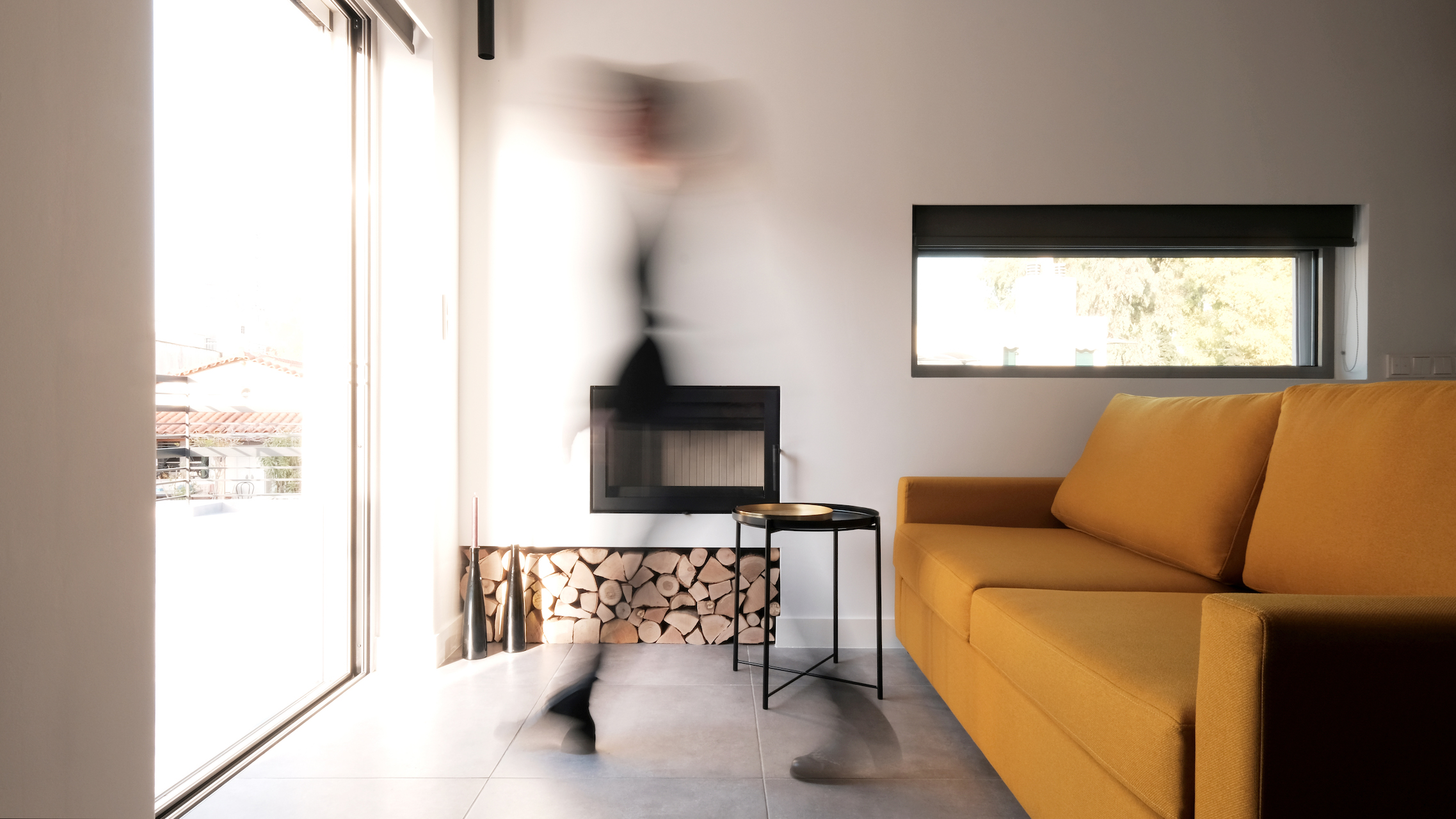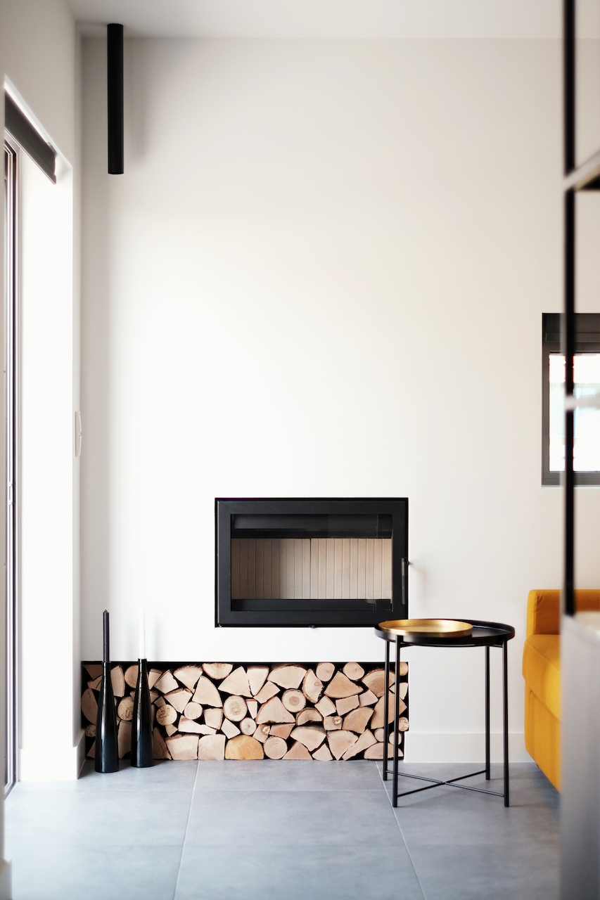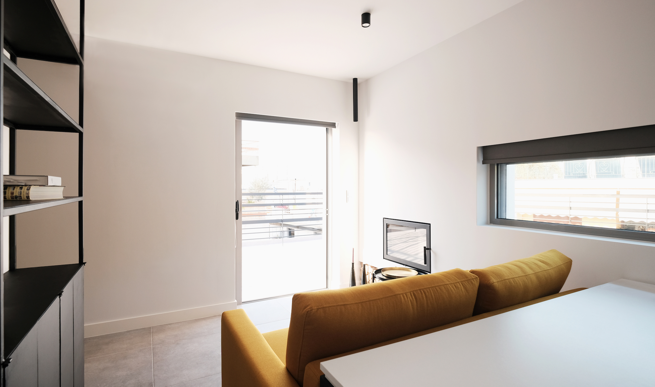 Το λευκό κυριαρχεί εντός και εκτός του μικρού διαμερίσματος που με αυτή τη χρωματική επιλογή δίνει την αίσθηση πως είναι μεγαλύτερο, ενώ παράλληλα υπάρχουν και έντονες αντιθέσεις με το μαύρο σε ορισμένες επιφάνειες και κίτρινες λεπτομέρειες που χαρίζουν χαρακτήρα στον χώρο. Οι γραμμές του σχεδιασμού είναι λιτές και γεωμετρικές.