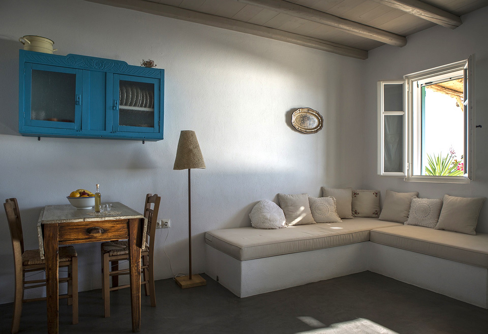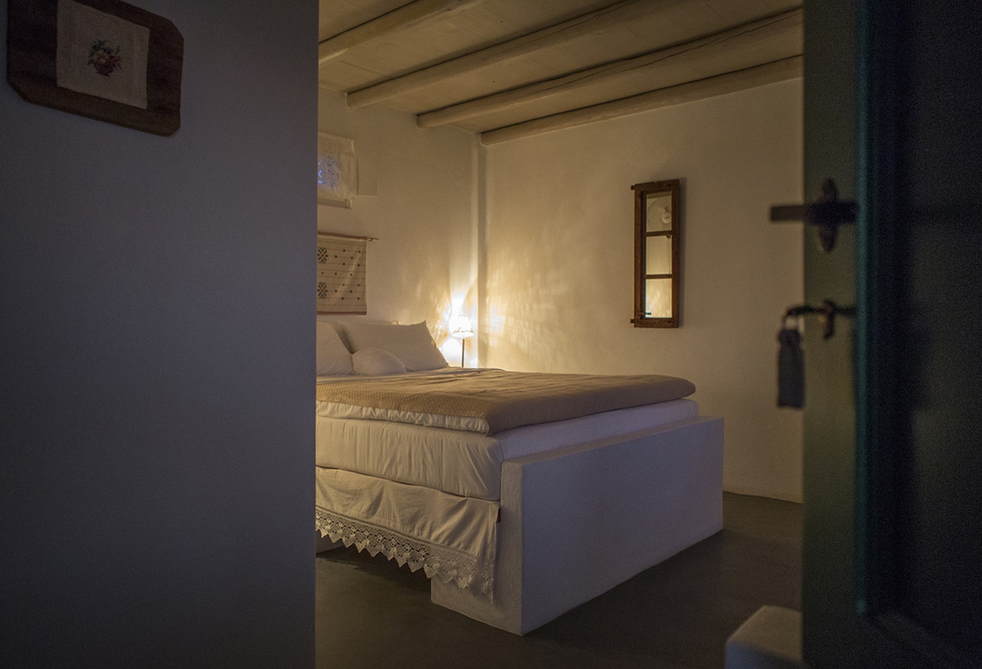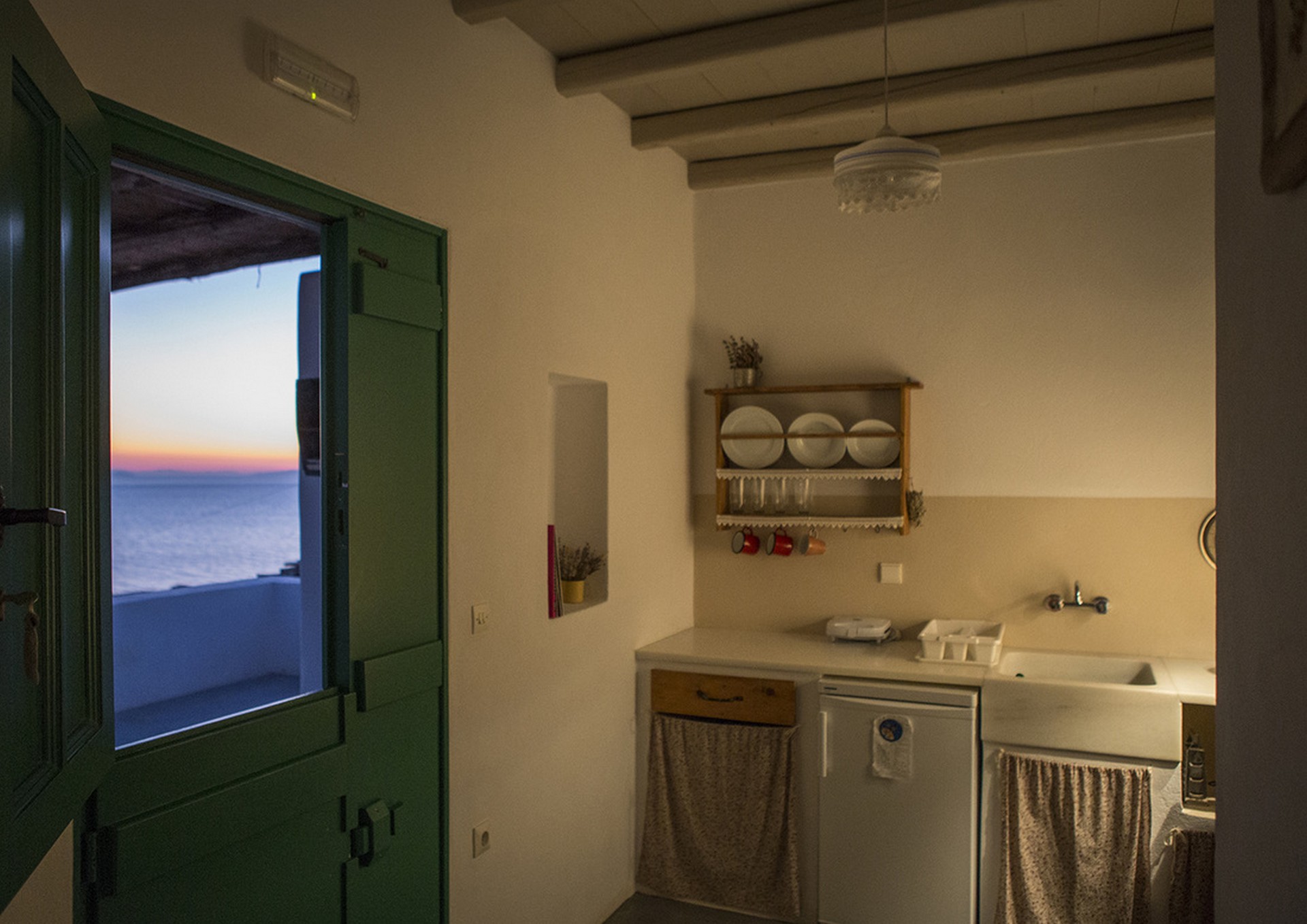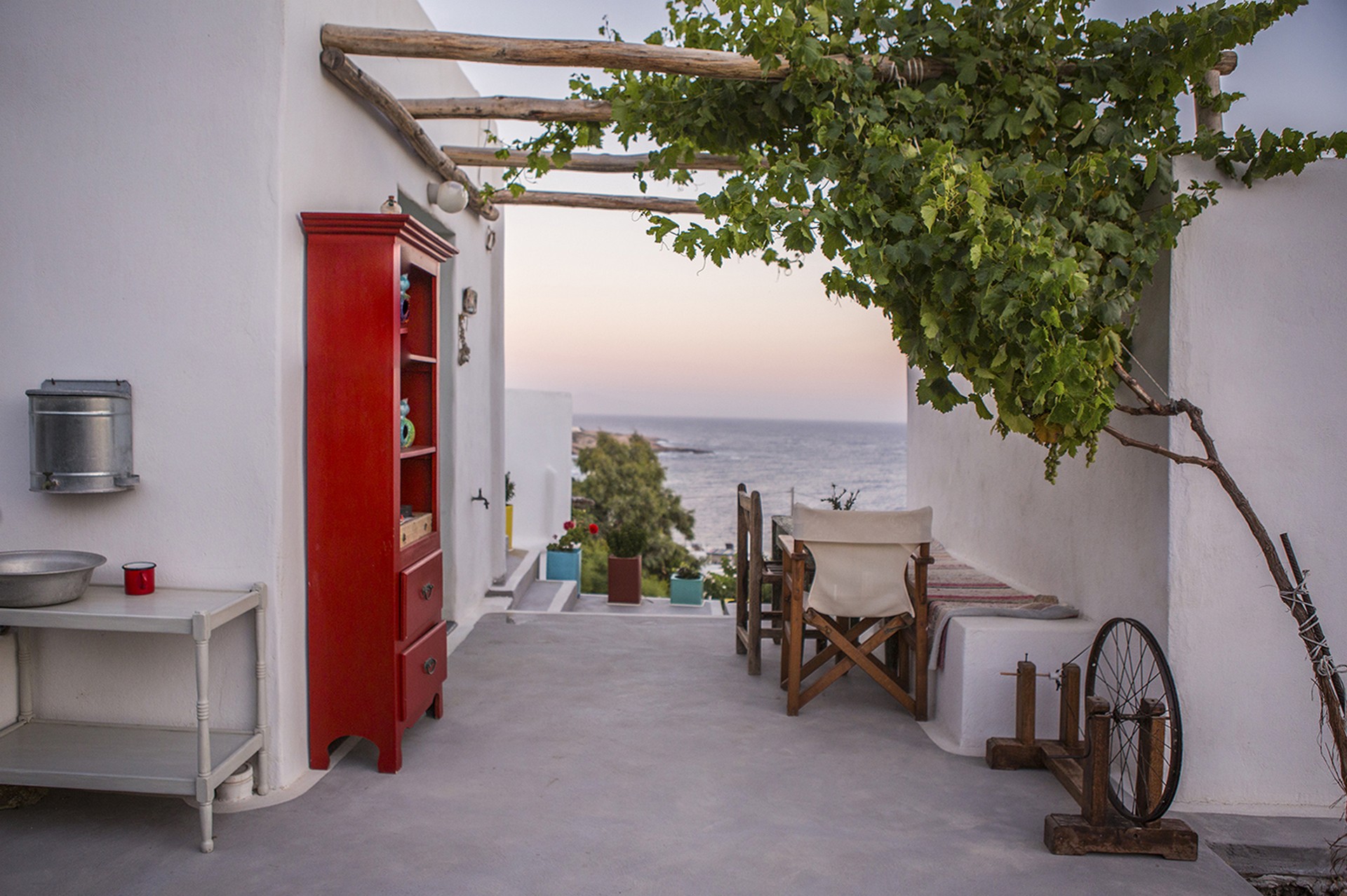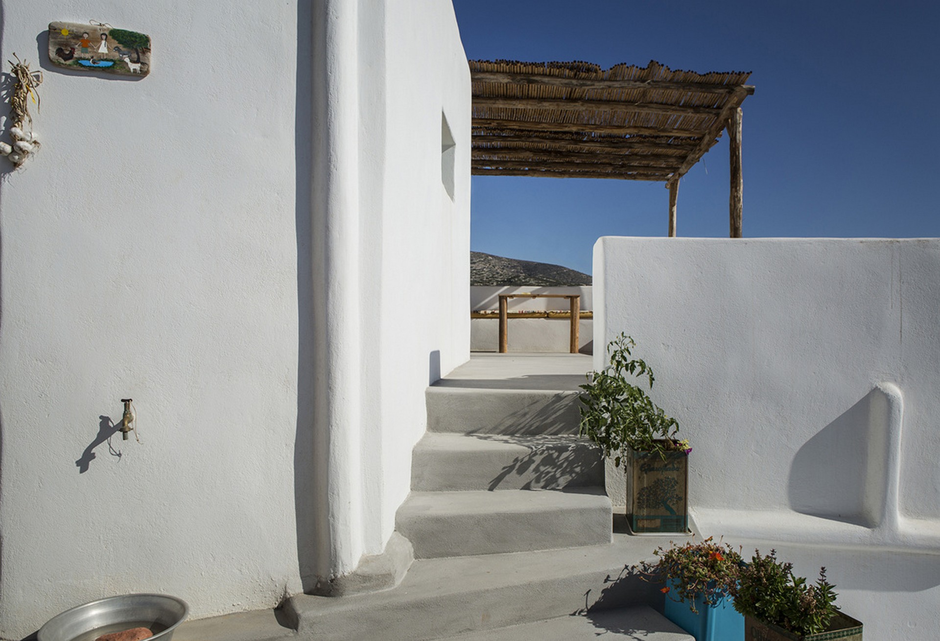 Άλλο μορφολογικό παραδοσιακό στοιχείο που επηρέασε την εξωτερική όψη του νέου κτιρίου είναι η συμμετρική πρόσοψη με την είσοδο στη μέση και δυο παράθυρα εκατέρωθεν. Το έντονο πράσινο χρώμα στα κουφώματα υπήρξε επίσης τυπικό για το νησί, καθώς και η «κουτσομπόλα» – η έξυπνη πόρτα εισόδου η οποία μπορεί να ανοίγει από τη μέση και πάνω λειτουργώντας και ως παράθυρο. Λεπτομέρειες της εσωτερικής διαμόρφωσης, όπως τα υπερυψωμένα χτιστά κρεβάτια, οι πατητές τσιμεντοκονίες μεταφέρουν την παραδοσιακή ατμόσφαιρα και μέσα. Η εσωτερική διαρρύθμιση των χώρων όμως δεν ακολουθεί τον παραδοσιακό κανόνα με τη «σάλα» στην πρόσοψη, αλλά δόθηκε προτεραιότητα στη λειτουργικότητα και σε υπνοδωμάτια με θέα στο χωριό, το Αιγαίο και τα γύρω νησιά.