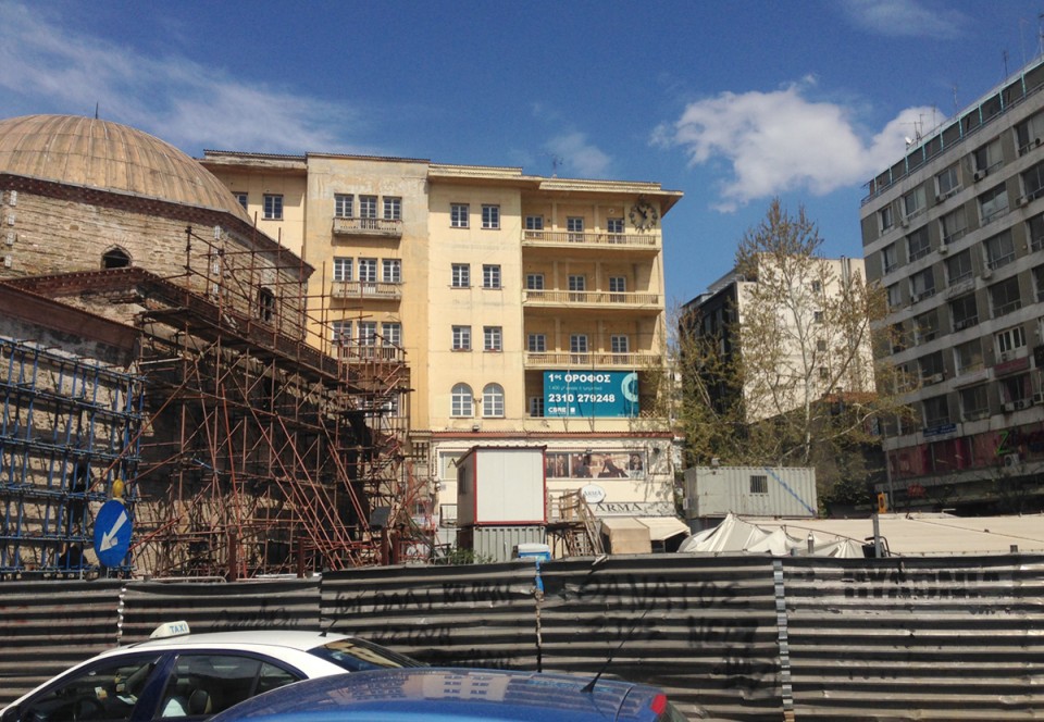 Λίγο πριν την Αριστοτέλους, το θρυλικό τσοντάδικο Αλκαζάρ (δεν μ΄έβγαλε ο δρόμος, έφυγα μικρός από την πόλη) στη διασταύρωση των οδών Εγνατία και Βενιζέλου, ή, το Χαμζά-Μπέη τζαμί (1468) επισκευάζεται. Αυτό βλέπεις στα αριστερά (βόρεια, προς Άνω Πόλη) κινούμενος σε σλάλομ στην Εγνατία (λόγω έργων του Μετρό) από το Βαρδάρι προς Καμάρα. Στο ίδιο σημείο, στα δεξιά μας (νότια, προς Παραλία) το Μπεζεστένι (Σκεπαστή αγορά)
