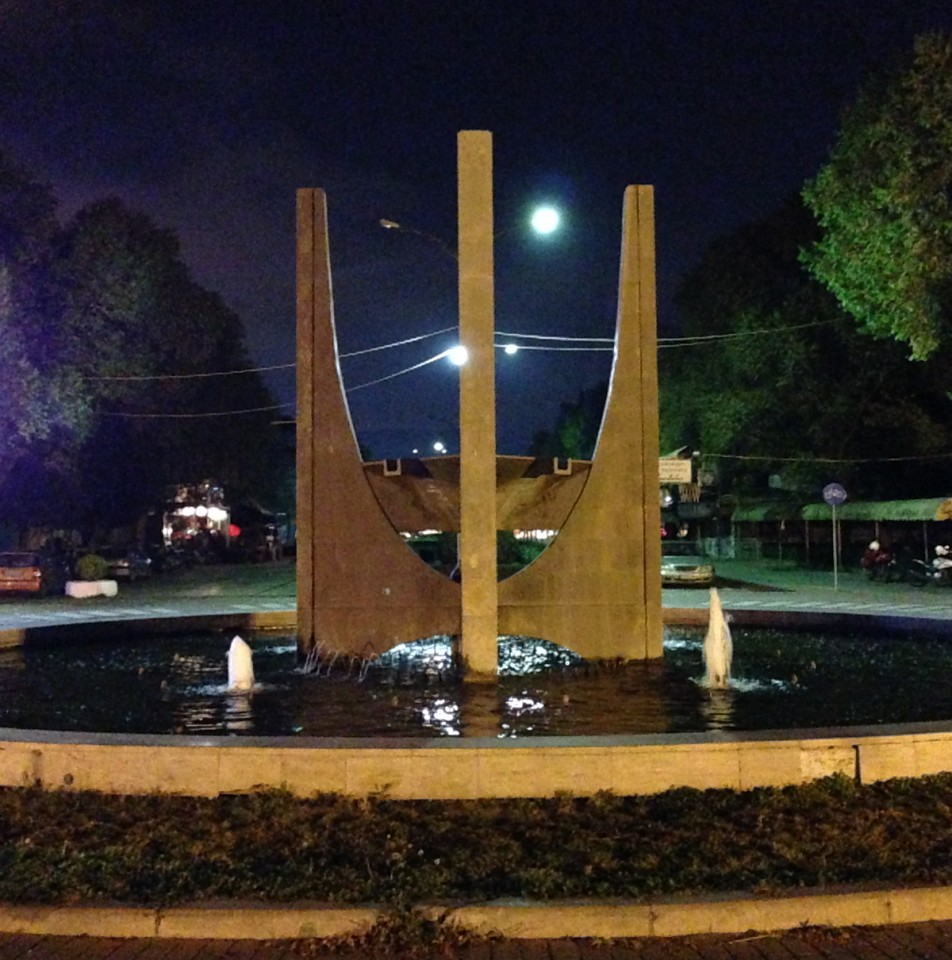 Αριστερά, το Συντριβάνι, επί Αμπντούλ Χαμίτ το πρωτότυπο, του 1977 το υφιστάμενο. Με πολλή προσπάθεια, πίσω από την αριστερή σιλουέτα στο βάθος, η Ροτόντα. Δεξιά, η απόληξη της Αγγελάκη, το γλυπτό του Ζογγολόπουλου και (νομίζω) η Αρχιτεκτονική Σχολή του ΑΠΘ.