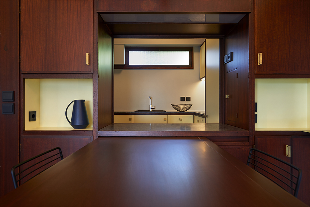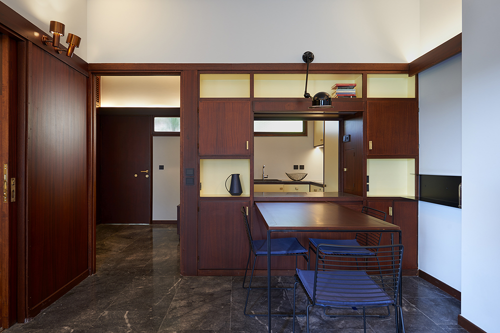 Το κυρίαρχο στοιχείο του χώρου είναι το ξύλινο πολυλειτουργικό διαχωριστικό μεταξύ κουζίνας και τραπεζαρίας – καθιστικού. «Το διαχωριστικό, χαρακτηριστικό στοιχείο στα μοντέρνα διαμερίσματα της εποχής, αποτελείται από εσοχές και κλειστά ντουλάπια και προς τους δύο χώρους ενώ ταυτόχρονα κάτω από τον μαρμάρινο πάγκο σερβιρίσματος “κρύβει” το συρόμενο τραπέζι φαγητού που ανοίγει προς το καθιστικό».