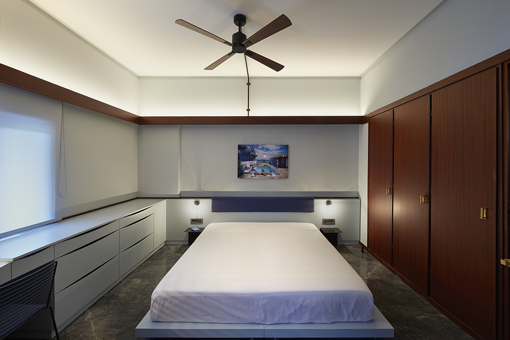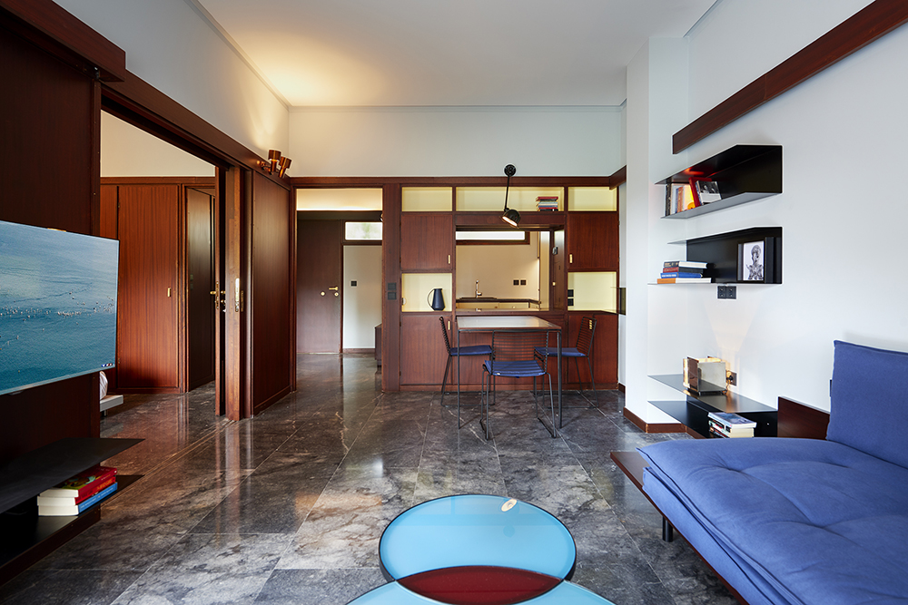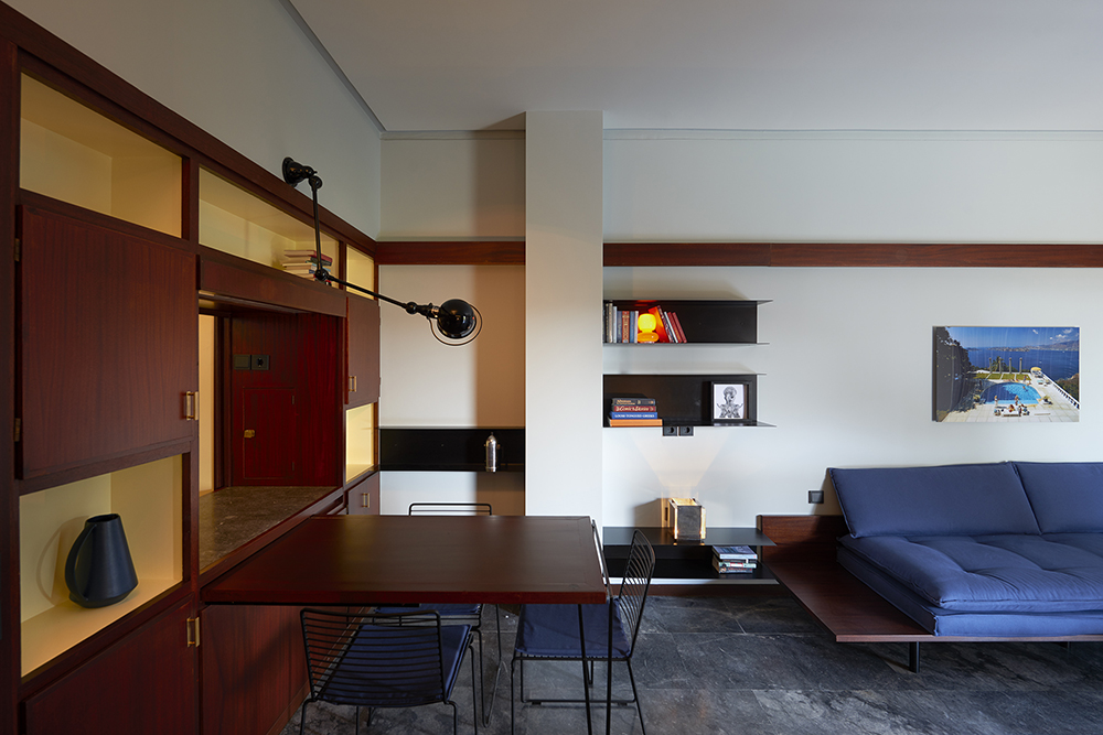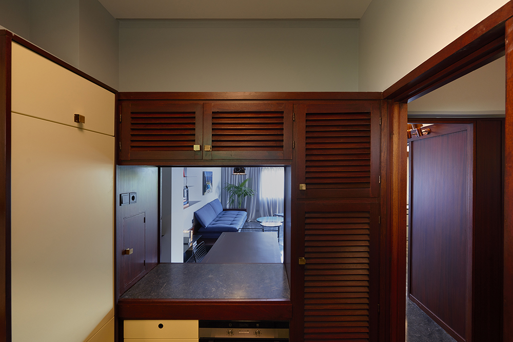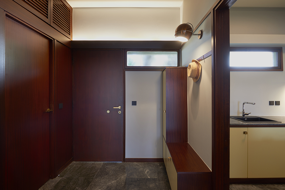 Παράλληλα, οι περιμετρικοί τοίχοι του διαμερίσματος χρωματίστηκαν με ένα ελαφρύ ανοιχτό γαλάζιο και οι οροφές με φωτεινό καθαρό λευκό. Οι υπάρχουσες ξύλινες επενδύσεις/διαχωριστικά, τα μπρούτζινα πόμολα και φωτιστικά επιδιορθώθηκαν διατηρώντας την τεχνολογικά απλή λειτουργικότητά τους και συντηρήθηκαν με επιμέλεια στην αρχική μορφή τους.