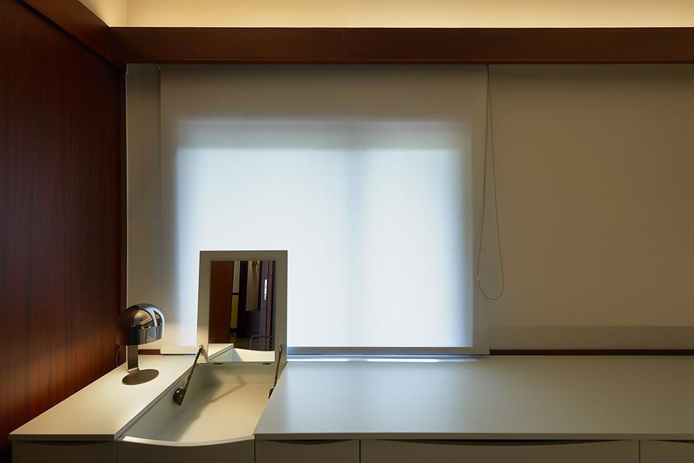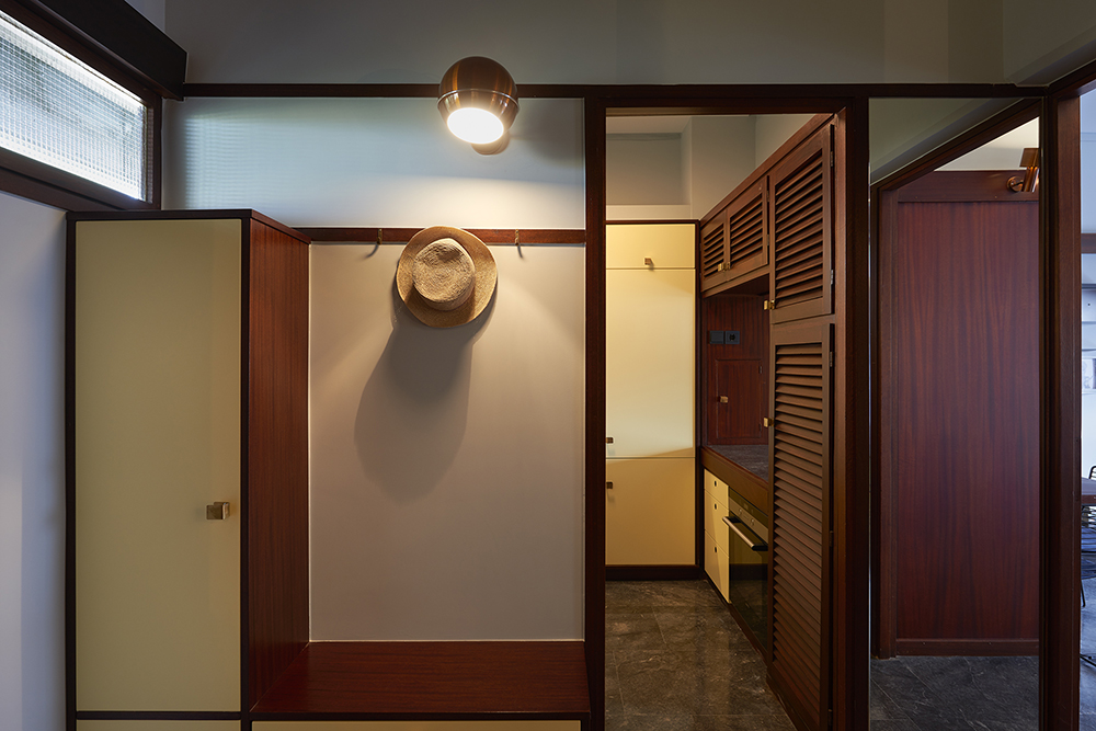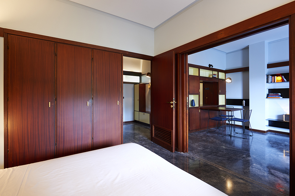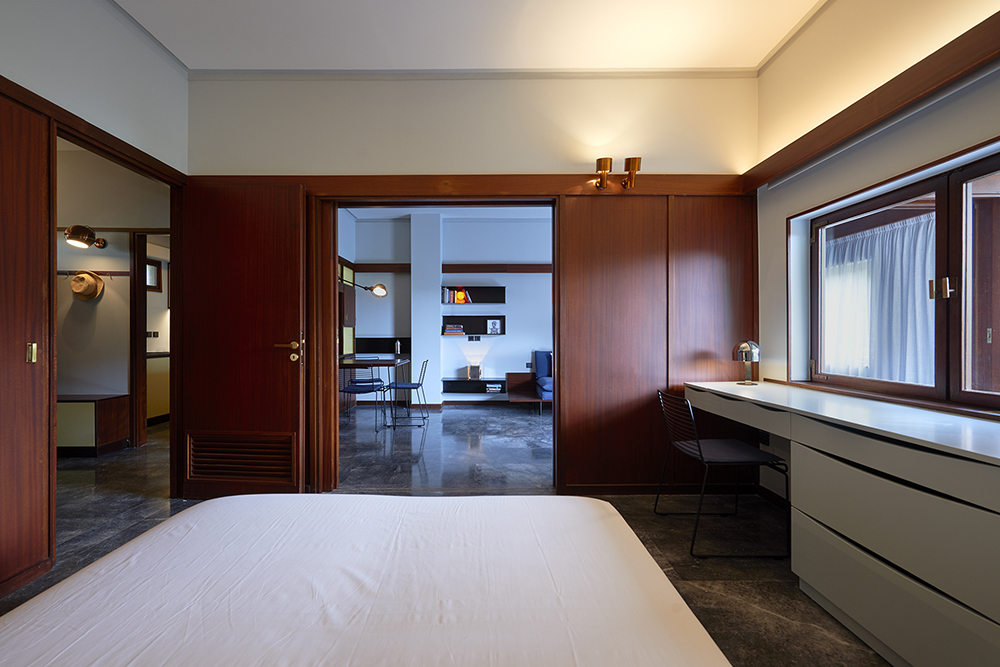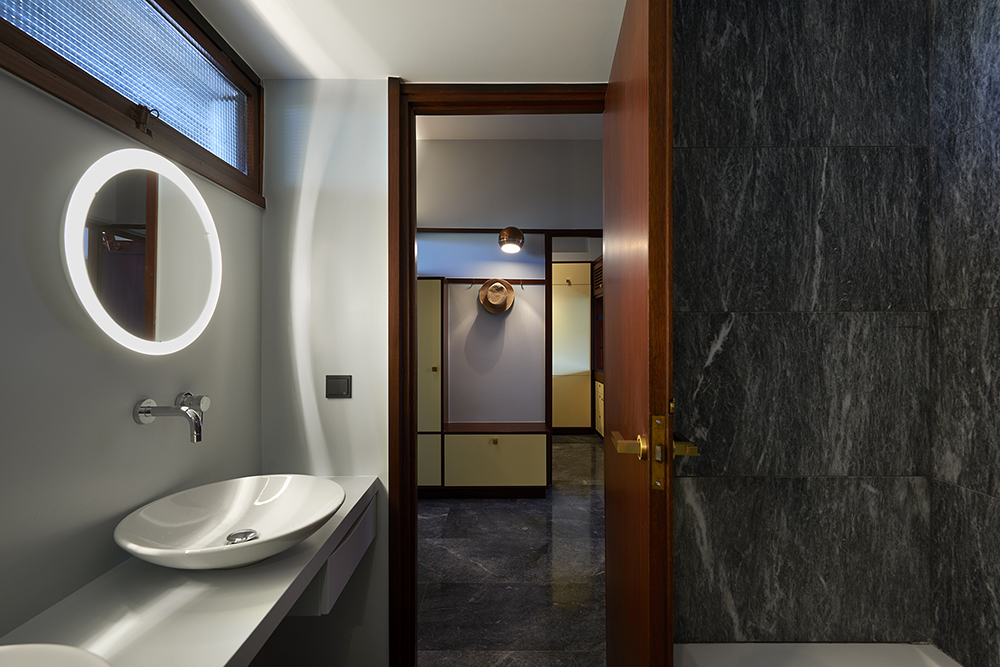 Παράλληλα, οι περιμετρικοί τοίχοι του διαμερίσματος χρωματίστηκαν με ένα ελαφρύ ανοιχτό γαλάζιο και οι οροφές με φωτεινό καθαρό λευκό. Οι υπάρχουσες ξύλινες επενδύσεις/διαχωριστικά, τα μπρούτζινα πόμολα και φωτιστικά επιδιορθώθηκαν διατηρώντας την τεχνολογικά απλή λειτουργικότητά τους και συντηρήθηκαν με επιμέλεια στην αρχική μορφή τους.