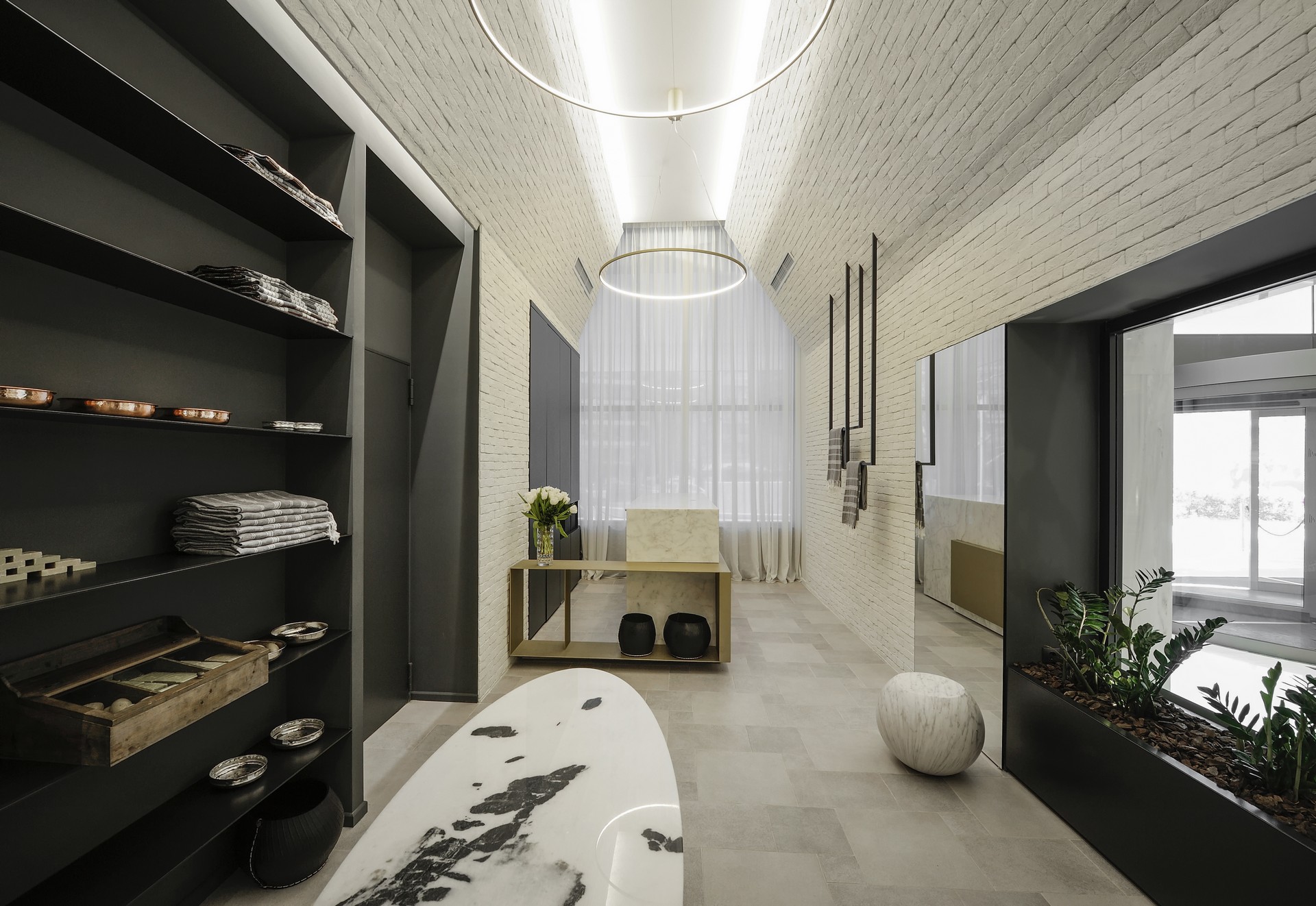 Στον στενόμακρο χώρο που βρίσκεται σε άμεση επαφή με το lobby του ξενοδοχείου, με το διπλό ύψος και τις μεγάλες τζαμαρίες, οι Α2 architects σχεδίασαν τον χώρο υποδοχής και ένα μικρό κατάστημα.