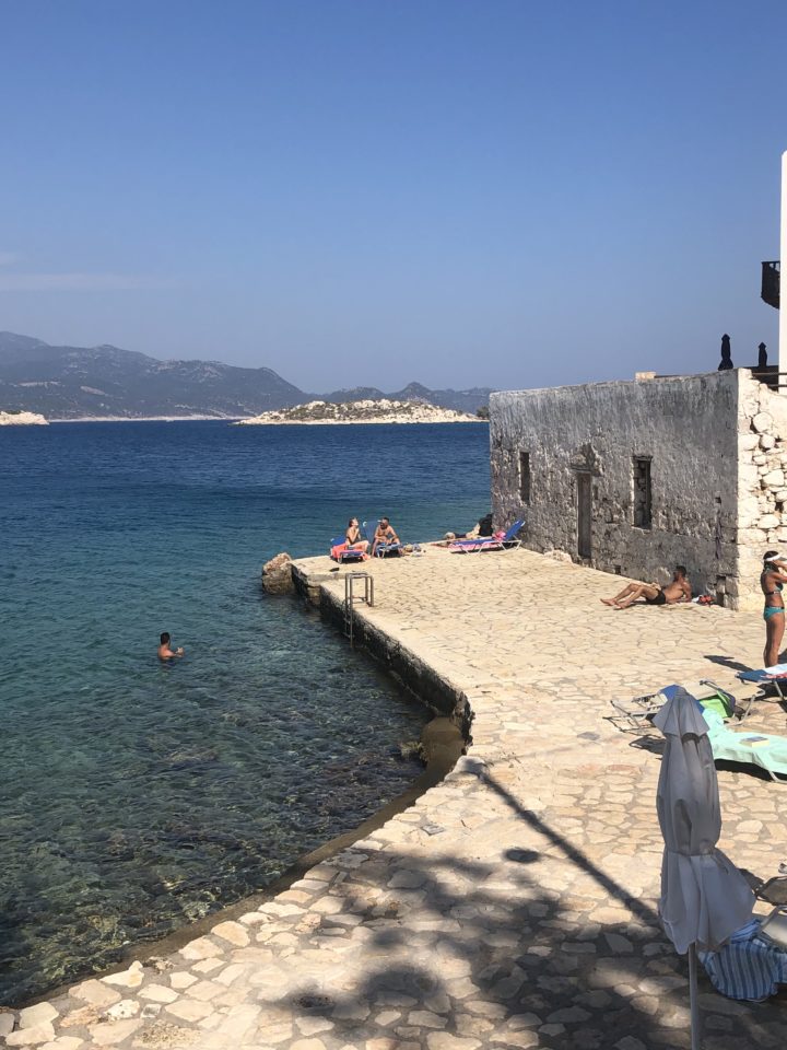(Σημαντικό: στο Καστελλόριζο δεν υπάρχουν παραλίες, κάτι που του χαρίζει έναν ιδιότυπο εξωτισμό. Σχεδόν από οποιοδήποτε σημείο του Π μπορείς να βουτήξεις στα πεντακάθαρα γαλαζοπράσινα νερά, υπάρχουν διαθέσιμοι βατήρες αλλά και σκαλάκια που οδηγούν σε καβάτζες-κοινά μυστικά. Για όσους δεν μπορούν να κόψουν την κακή συνήθεια της άμμου, ότι κοντινότερο σε παραλία υπάρχει στο Μανδράκι. Έξτρα προορισμοί, οι Πλάκες/ το νησάκι του Αϊ Γιώργη/ η σκοτεινή σπηλιά-τουριστική ατραξιόν. Σε πάνε βαρκάρηδες που τους λένε Γιώργο-Κώστα-Σταύρο, είναι στα 50-60-70 τους (ή κάπου ανάμεσα) και λειτουργούν ως jack of all trades, λύνουν κάθε πρόβλημα από το δωμάτιο μέχρι το φαγητό σου και θυμούνται να ρωτήσουν και την Αγγλίδα με τον στομαχόπονο αν αισθάνεται καλύτερα.)