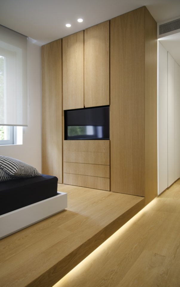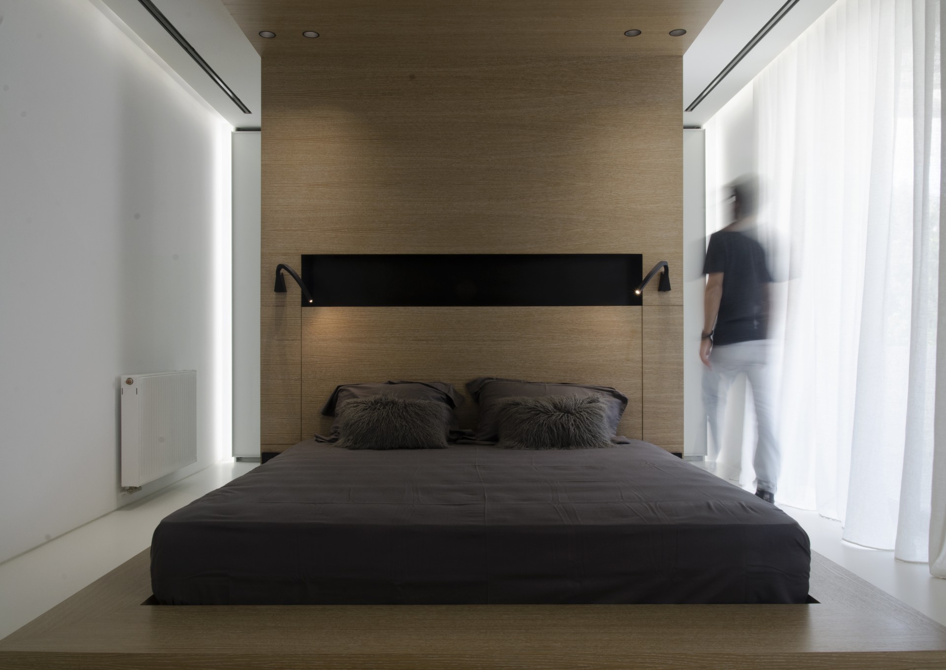 Στο κύριο υπνοδωμάτιο και στα παιδικά δωμάτια, έχει γίνει σχεδιασμός σχεδόν όλων των επίπλων, ώστε να επιτευχθεί ένα ενιαίο αρμονικό σύνολο. Γίνεται εκτεταμένη χρήση δρυ, και στο πάτωμα και σαν επένδυση και στα έπιπλα, ώστε να προσδώσει στο χώρο τη ζεστασιά που χρειάζονται οι ιδιωτικοί αυτοί χώροι. «Το κρεβάτι έχει σχεδιαστεί σαν ένα ξύλινο κουκούλι, ενώ η χρήση του ξύλου επεκτείνεται και στο κυρίως λουτρό και αναπαράγει την ίδια φιλοσοφία. Έχουν σχεδιαστεί δύο ξεχωριστά walk-in-closets τα οποία με τη χρήση του καθρέφτη εξαφανίζονται στον χώρο», εξηγεί η Κατερίνα Καραγιάννη.
