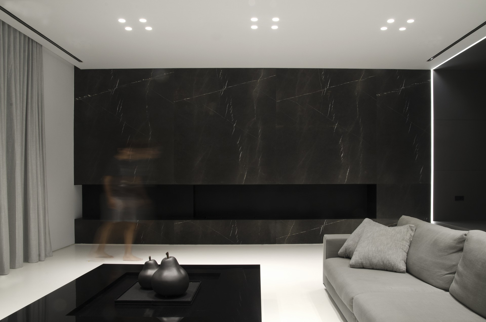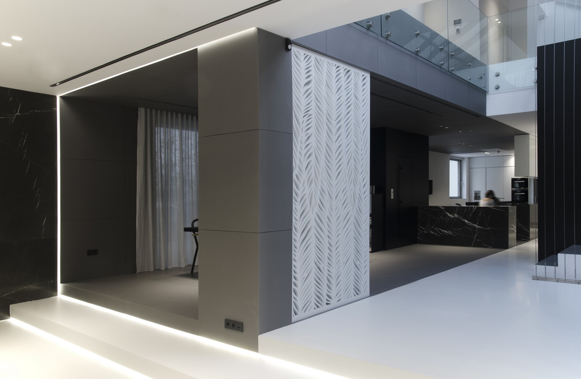 Ο χώρος παραμένει οπτικά ενιαίος, αλλά λειτουργικά διαχωρισμένος, ώστε να εξυπηρετεί τις διαφορετικές χρήσεις και εκφάνσεις μιας σύγχρονης κατοικίας. Ουσιαστικά τα υλικά που χρησιμοποιήθηκαν χωρίζονται σε δυο κατηγορίες: «Αυτά που λειτουργούν σαν υπόβαθρο, όπως είναι τα λευκά αυτοεπιπεδούμενα δάπεδα, και αυτά που λειτουργούν σαν highlights, όπως είναι το μαύρο μάρμαρο».