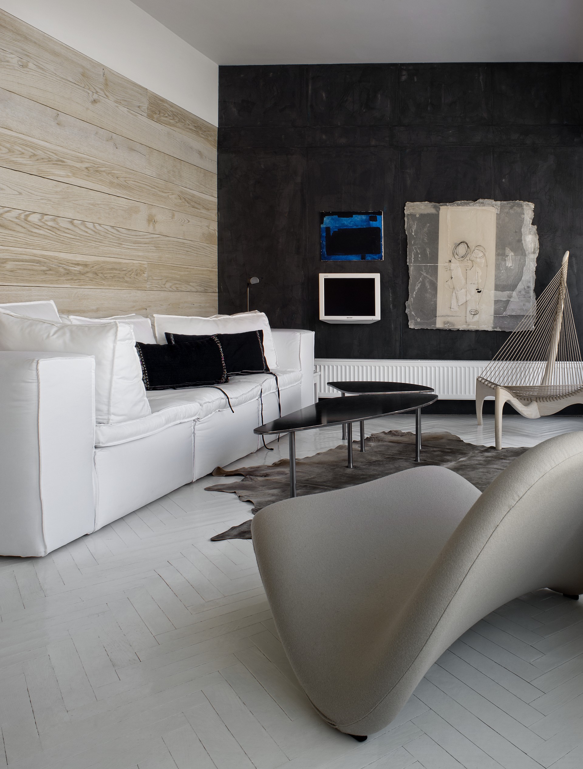 Το λευκό που κυριαρχεί στο σύνολο των δαπέδων και των οροφών του διαμερίσματος που μετρά 200 τετραγωνικά μέτρα έρχεται σε μια αρμονική αντίθεση με την μαύρη πατίνα στο σύνολο των κρυφών αποθηκευτικών χώρων, έχει massif ακατέργαστες δρύινες επενδύσεις και μάρμαρο Αλιβερίου στους υγρούς χώρους.