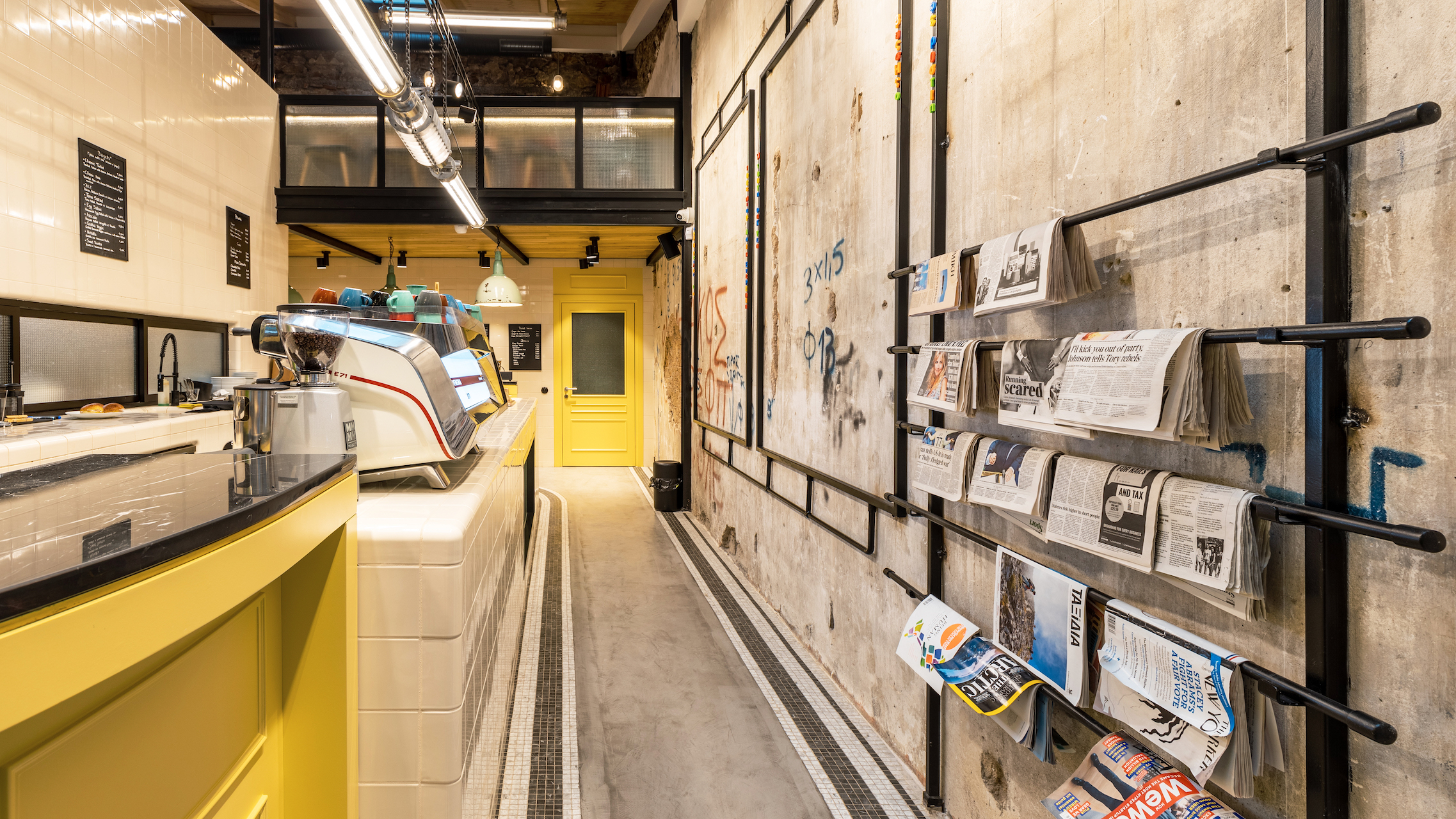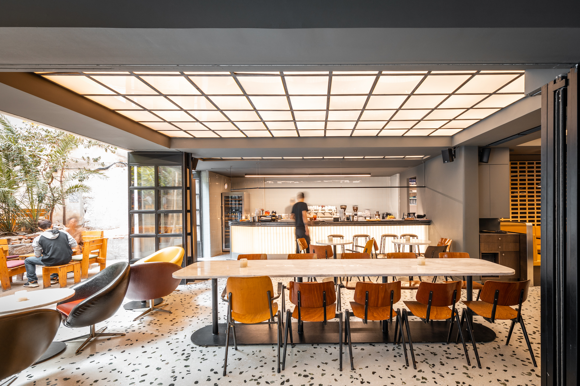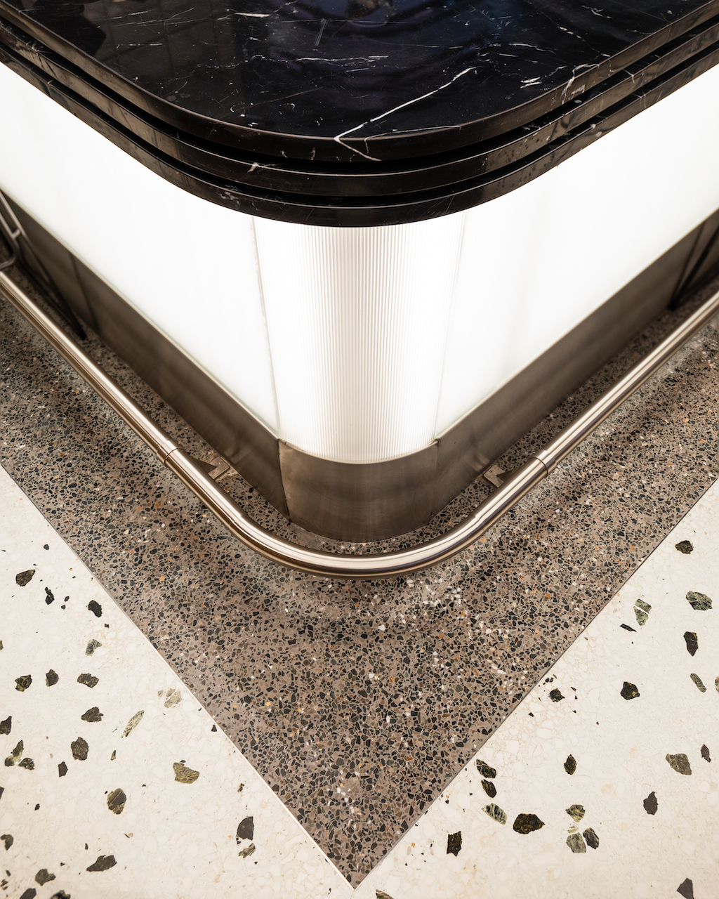 «Οι ιδιοκτήτες ήθελαν αυτός ο ενδιάμεσος χώρος που ήταν χρόνια κλειστός και κρυφός από τους θαμώνες του μαγαζιού, να ανοίξει ξαφνικά προς το κοινό αποκαλύπτοντας έναν χώρο που ίσως και να βρισκόταν εκεί από πάντα. Το ύφος και η ατμόσφαιρα του νέου χώρου ορίστηκαν κατά κύριο λόγο από τα υλικά που χρησιμοποιήθηκαν, όπως το μάρμαρο, το μωσαϊκό, το ριγωτό τζάμι, το εμφανές τσιμέντο, το ξύλο, το tabac δέρμα, το μαύρο μέταλλο και το κεραμικό επισμαλτωμένο πλακάκι μαζί με την χρωματική παλέτα που επιλέχθηκε και τις αυστηρές γεωμετρίες στις οποίες καταφύγαμε», περιγράφουν οι αρχιτέκτονες.