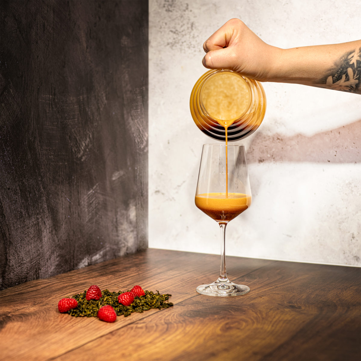 Στο πλαίσιο του προγράμματος barista απαιτείται η παρασκευή τεσσάρων espresso, τεσσάρων milk beverages (καφές με γάλα) και ενός Signature Beverage ροφήματος με βάση το espresso. Στο δικό μου Signature Beverage ρόφημα χρησιμοποίησα δύο διπλά espresso από την ποικιλία-υβρίδιο CGLE17 από την Café Granja La Esperanza της Κολομβίας. Επίσης πρόσθεσα άλλα δυο σημαντικά υλικά. Το πρώτο ήταν ένα διάλυμα από raspberries τα οποία είχαν υποστεί ζύμωση σε ελεγχόμενο περιβάλλον με σταθερή θερμοκρασία. Το δεύτερο υλικό ήταν ένα εκχύλισμα από πράσινο τσάι και πιο συγκεκριμένα ένα Oolong Milky Tea. Τα δυο αυτά υλικά, σε συνδυασμό με τον espresso, μας προσφέρουν ένα πολύ ιδιαίτερο, φρουτένιο και γλυκό χαρακτήρα με νότες από κεράσι, ρόδι, ροδάκινο και καραμέλα, όλα σε μια βελούδινη υφή.