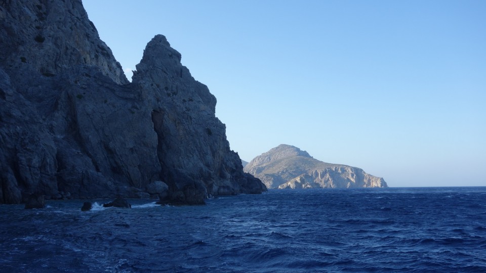Το γκρι το συναντάς σε όλες τις αποχρώσεις, από το υπόλευκο σταχτί, μέχρι το σκούρο γκρι, και το μαύρο, κυρίως στη βάση τους, εκεί που συναντιούνται με το νερό της θάλασσας. Άλλες φορές κοκκινωπές περιοχές κάνουν τοπικά την εμφάνισή τους μέχρι να συναντήσεις ξανά την απόλυτη κυριαρχία του γκρίζου. Κι ανάμεσά τους πάμπολλες σπηλιές, σαν μαύρες τρύπες στο σύμπαν της γκρίζας επικράτειας, στέκουν άλλοτε ψηλά κι άλλοτε κάτω χαμηλά στη θάλασσα δημιουργώντας μυστηριώδεις κόγχες στο σώμα των βράχων. Κι όπως πέφτει το φως πάνω τους γεννά ένα πλήθος φωτοσκιάσεων, εναλλαγών και διακυμάνσεων που μαγνητίζουν το βλέμμα και σε ταξιδεύουν νοερά σε κόσμους μαγικούς, ονειρικούς, φανταστικούς. Ψηλά, εμφανίζονται κάθε τόσο μαυριδερά γεράκια να σκίζουν τον αέρα πραγματοποιώντας απίθανες εφορμήσεις κι άλλοτε αφήνονται να παρασυρθούν ελεύθερα απ’ τις ριπές του, σε πτήσεις ακανόνιστες, θαρρείς και χαίρονται την παντοδυναμία τους στους αιθέρες.