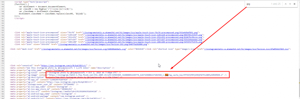 Ευρισκόμενοι στη σελίδα μιας φωτογραφίας/δημοσίευσης στο Instagram, κάντε δεξί «κλικ» επάνω της και στο μενού που αναδύεται, επιλέξτε το “Προβολή κώδικα σελίδας” (View page source ή απλά Ctrl + U). Στη σελίδα που ανοίγει, αναζητήστε για “.jpg” και στα αποτελέσματα που θα πάρετε, ψάξτε για το URL που ξεκινά με το “https://instagram.fath3-2.fna” και μετά το “.jpg” υπάρχει ακόμα ένα μακρυνάρι που ξεκινά ως “?ig_cache_key=”.