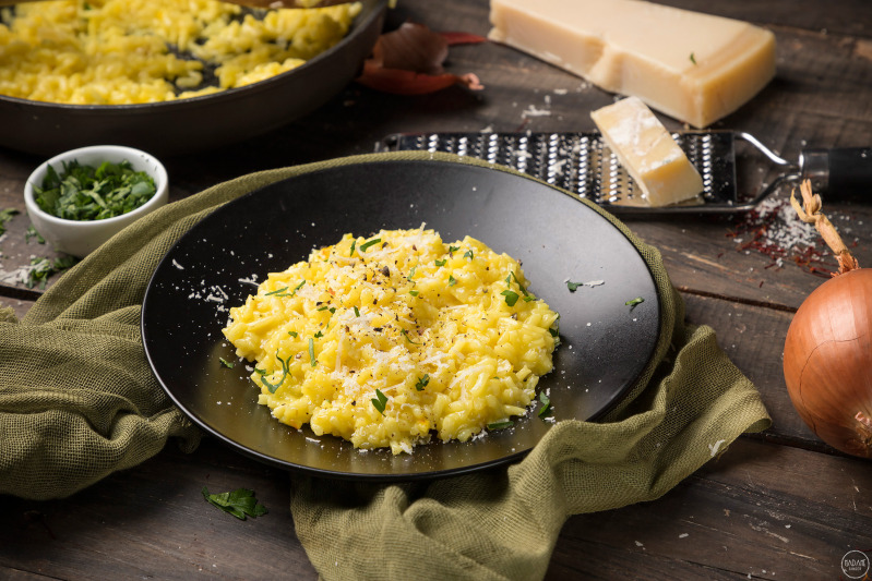 Ξέχνα γενναίες ποσότητες βουτύρου και κρέμες γάλακτος με τις οποίες μπορεί να έχεις συνδυάσει το ριζότο. Σκέψου απλά. Ελαιόλαδο, λευκό κρασί, άρωμα και χρυσαφένιο χρώμα από το σαφράν, σωστά χυλωμένο risotto και τριμμένη παρμεζάνα που με την umami γεύση του θα κάνει το ριζότο σου ακαταμάχητο. Υπομονή -σταδιακά να πέφτει ο καυτός ζωμός στο ρύζι- και στιγμή να μην αφήσεις το ριζότο μόνο του και σου κολλήσει στον πάτο της κατσαρόλας. Δεν χρειάζεται να είσαι chef για να το πετύχεις. Αγάπη για αυτό που μαγειρεύεις χρειάζεται.