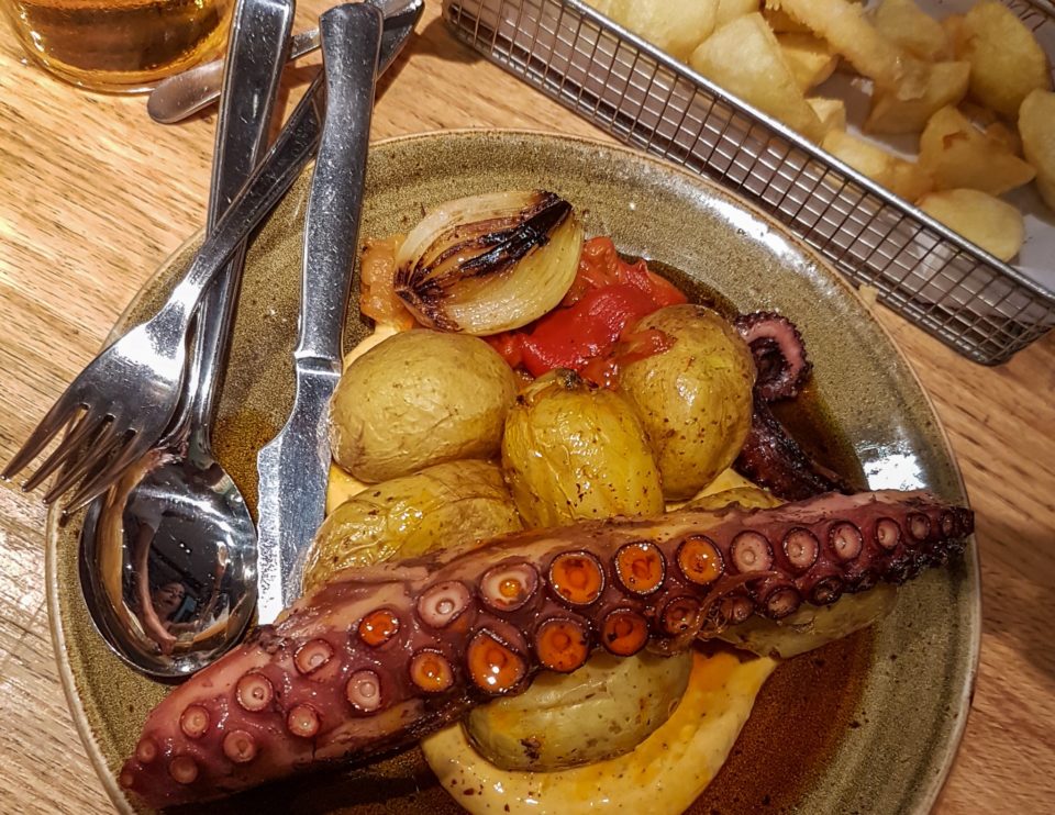 Κλασικό πιάτο της περιοχής. Βρασμένο και μετά ψημένο χταπόδι (pulpo) με διάφορα καρυκεύματα. Baby πατάτα και από κάτω μια στρώση από κάτι μεταξύ πουρέ και φάβας.
