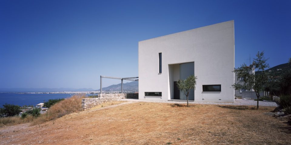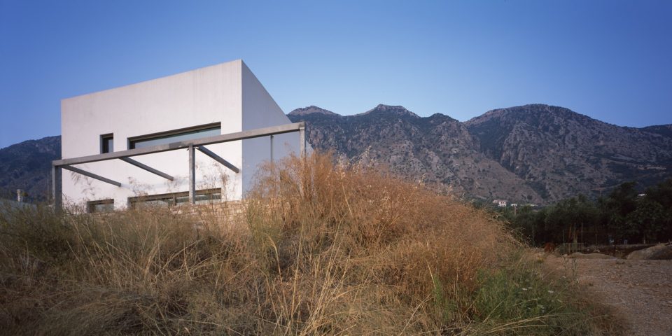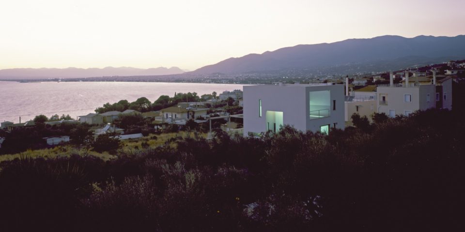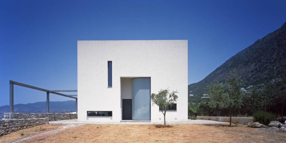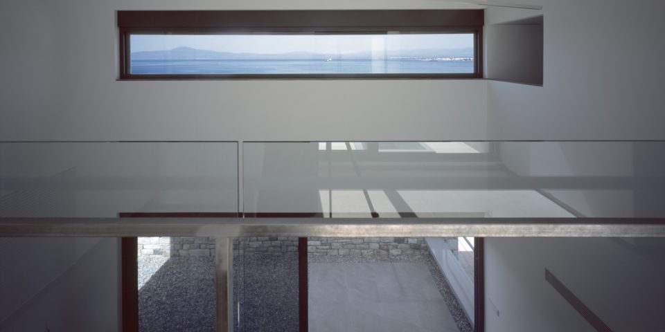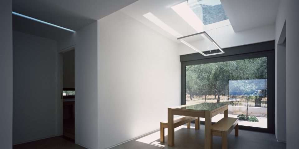 Αποφάσισαν να φέρουν το τοπίο μέσα στο σπίτι, δημιουργώντας μια κεντρική διαμπερή ζώνη που στη µία άκρη της έχει την τραπεζαρία προς τον ελαιώνα και στην άλλη το καθιστικό με θέα προς τη θάλασσας. Σε επιλεγμένα σημεία κατά την κατασκευή του σπιτιού σχεδίασαν σχισμές, που λειτουργούν σαν κάδρα για τις διαφορετικές πολλαπλές θεάσεις του βουνού και της θάλασσας, ανάλογα µε την εποχή και την ώρα της ημέρας.
