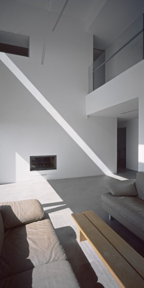 Αν και εξωτερικά το σπίτι είναι ένας µονολιθικός όγκος, το αρχιτεκτονικό γραφείο έδωσε έμφαση σε στοιχεία του εσωτερικού, όπως το διώροφο καθιστικό και η οργάνωση των ιδιωτικών και βοηθητικών χώρων γύρω από αυτόν τον πυρήνα. Επίσης, επέλεξαν προσεκτικά πότε ο εξωτερικός χώρος είτε θα εισβάλλει, είτε θα μείνει εκτός του σπιτιού. «Στις περιοχές, που θέλαμε να ενοποιήσουµε το μέσα µε το έξω, δηλαδή στο καθιστικό και την τραπεζαρία, επεκτείναμε το υλικό του δαπέδου προς τα έξω. Διαλέξαμε ένα είδος πλακιδίου γρανίτη, που χρησιμοποιείται τόσο σε εσωτερικούς όσο και σε εξωτερικούς χώρους, µε ελαφρύ ανάγλυφο».