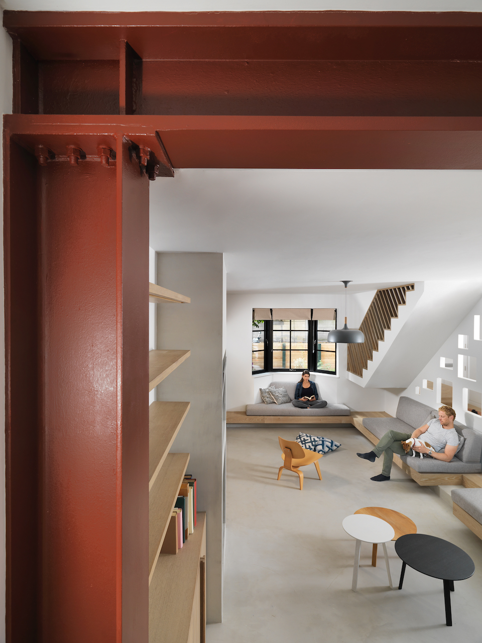 Στο “Verdun Road”, μια εμφανής χαλύβδινη δοκός -με μήκος εννέα μέτρων- που εκτείνεται κατά πλάτος του χώρου, πλαισιώνει τη ζωή μέσα στο σπίτι και δημιουργεί ένα ανοιχτό ισόγειο χωρίς κολώνες. Ένα βυθισμένο, χτιστό καθιστικό με ενσωματωμένο καναπέ, λειτουργεί σαν ένα διακριτικό χώρισμα μεταξύ των λειτουργιών της ανοιχτής κάτοψης.