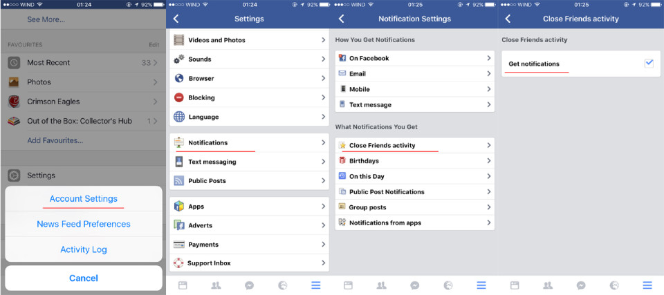 Για να ενεργοποιήσετε τώρα τις ειδοποιήσεις για τους στενούς σας φίλους, θα πρέπει να ανοίξετε το app του Facebook στο smartphone σας και να πατήσετε το εικονίδιο με τις τρεις οριζόντιες γραμμές στην κάτω δεξιά γωνία. Πηγαίνετε στο τέρμα του μενού που ανοίγει και επιλέξτε αρχικά “Settings” και εν συνεχεία “Account Settings”. Θα μεταφερθείτε σε μία διαφορετικού στυλ οθόνη στην οποία θα πρέπει να εντοπίσετε το “Notifications”: πατήστε το και κατόπιν βρείτε την επιλογή “Close Friends activity”. Κάντε «κλικ» εκεί και φροντίστε το “Get notifications” να είναι επιλεγμένο: αυτό ήταν όλο! Τώρα, κάθε φορά που κάποιος εκ των «στενών σας φίλων» κάνει κάτι στο Facebook, εσείς θα είστε οι πρώτοι που θα το μαθαίνετε, καθώς θα εμφανίζεται ως ειδοποίηση στη συσκευή σας, ακόμα κι αν αυτή είναι κλειδωμένη –θα βγαίνει στην οθόνη κλειδώματος.