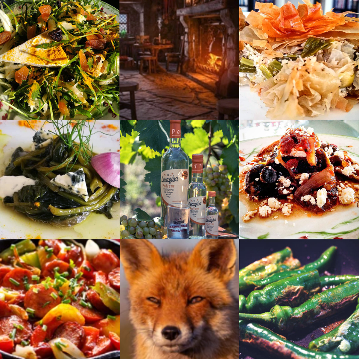 Κάτσαμε δίπλα στο τζάκι, σ’ ένα παλιό τραπέζι–ροτόντα και σαν από το πουθενά φτάνουν τα πρώτα τσίπουρα, καραφάκια – Δεκαράκια Ροδίτης – και ‘’παρέα’’ τους κι ένας γέρος που κρατούσε μια παλιά σκαλιστή μαγκούρα με το κεφάλι μιας αλεπούς στεφανωμένης με ένα τσαμπί σταφύλι στην κορυφή της.