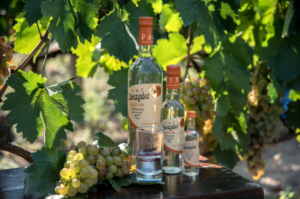 Καθαρό, κρυστάλλινο, με πυκνά δάκρυα που κατεβαίνουν με μέτρια ταχύτητα, με ήπιο αρωματικό χαρακτήρα, αρώματα μελιού, λεμονιού, και μπανάνας, και με ελαφρύ προς μέτριο σώμα, το Δεκαράκι Ροδίτης είναι ένα σπουδαίο και ευκολόπιοτο ξηρό απόσταγμα με στρογγυλή, γεμάτη και μαλακή γεύση.