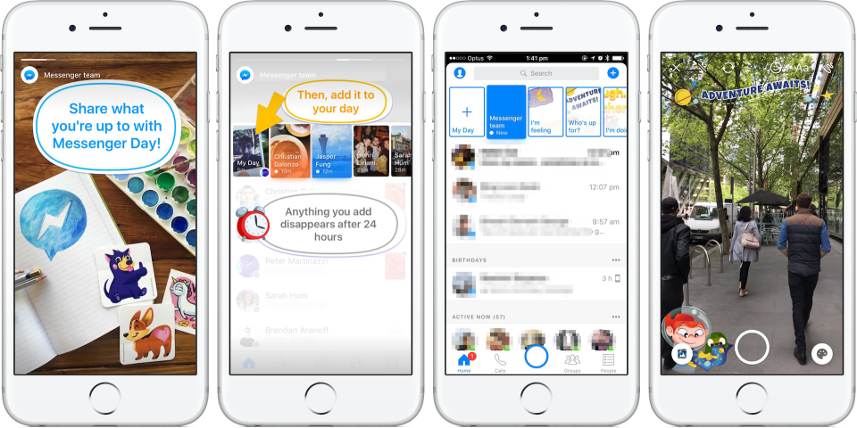 Το Messenger Day λοιπόν στον πυρήνα του δεν διαφέρει καθόλου από τα Stories του Snapchat και του Instagram. Οι χρήστες μπορούν να τραβούν φωτογραφίες και βίντεο, να τα επεξεργάζονται εν τάχει εφαρμόζοντας φίλτρα και προσθέτοντας εφέ και κείμενο και να τα μοιράζονται με τους φίλους τους, μέχρι αυτά να εξαφανιστούν έπειτα από 24 ώρες. Χάρη δε στα φίλτρα διαθεσιμότητας του Messenger (το γνωστό “Who’s up for?” και βέβαια το αν κάποιος είναι “active now” ή όχι), το Messenger Day μπορεί κάλλιστα να χρησιμοποιηθεί για να βρει κάποιος παρέα είτε για βόλτα, είτε για μια γρήγορη κουβέντα.