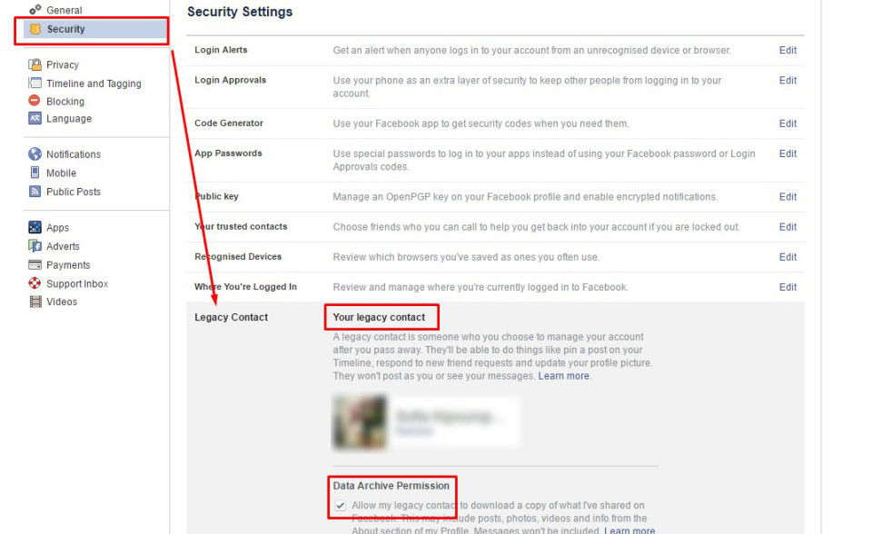 Απαραίτητη προϋπόθεση για να γίνουν όλα τα παραπάνω βέβαια, είναι να έχετε ορίσει, όσο βρίσκεστε μαζί μας στον μάταιο τούτο κόσμο, ποιος θα είναι ο… κληρονόμος και διαχειριστής του προφίλ σας. Για να το κάνετε, θα πάτε στο βελάκι στην πάνω δεξιά γωνία της οριζόντιας μπλε μπάρας σε οποιαδήποτε –web- σελίδα του Facebook, θα επιλέξετε τα “Settings” και στην οθόνη που εμφανίζεται, το “Security”. H ενότητα που αναζητάτε είναι το “Legacy Contact”. Εκεί θα ορίσετε τη μία επαφή που θέλετε να αναλάβει τη διαχείριση του λογαριασμού σας, ενώ προαιρετικά τικάρετε και κουτάκι από κάτω έτσι ώστε η επαφή αυτή να μπορεί να πάρει καθετί έχετε μοιραστεί στο Facebook σε ένα αρχείο. Αν πάλι θέλετε να διαγραφεί τελείως το προφίλ σας, τότε πηγαίνετε λίγο πιο κάτω, στο link που γράφει “Request account deletion”.