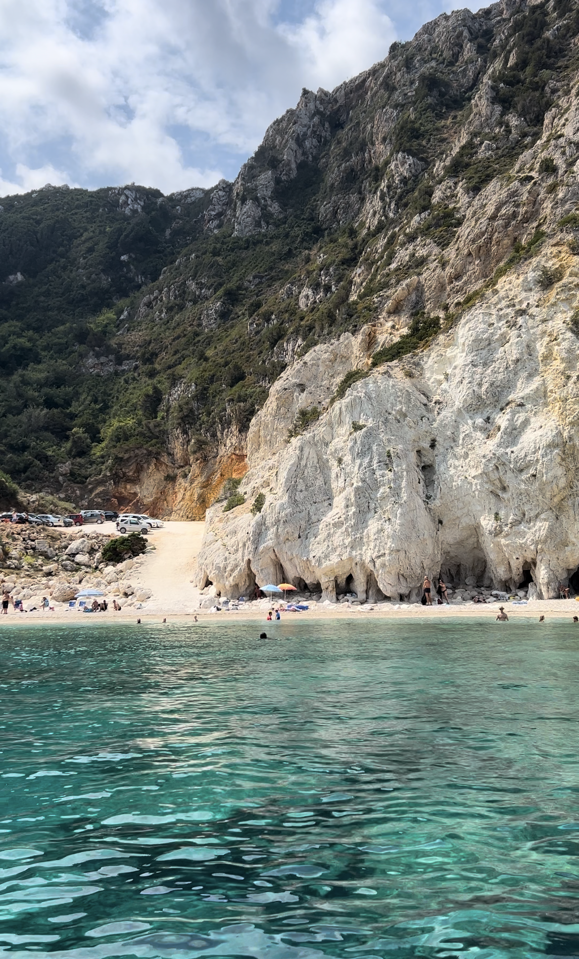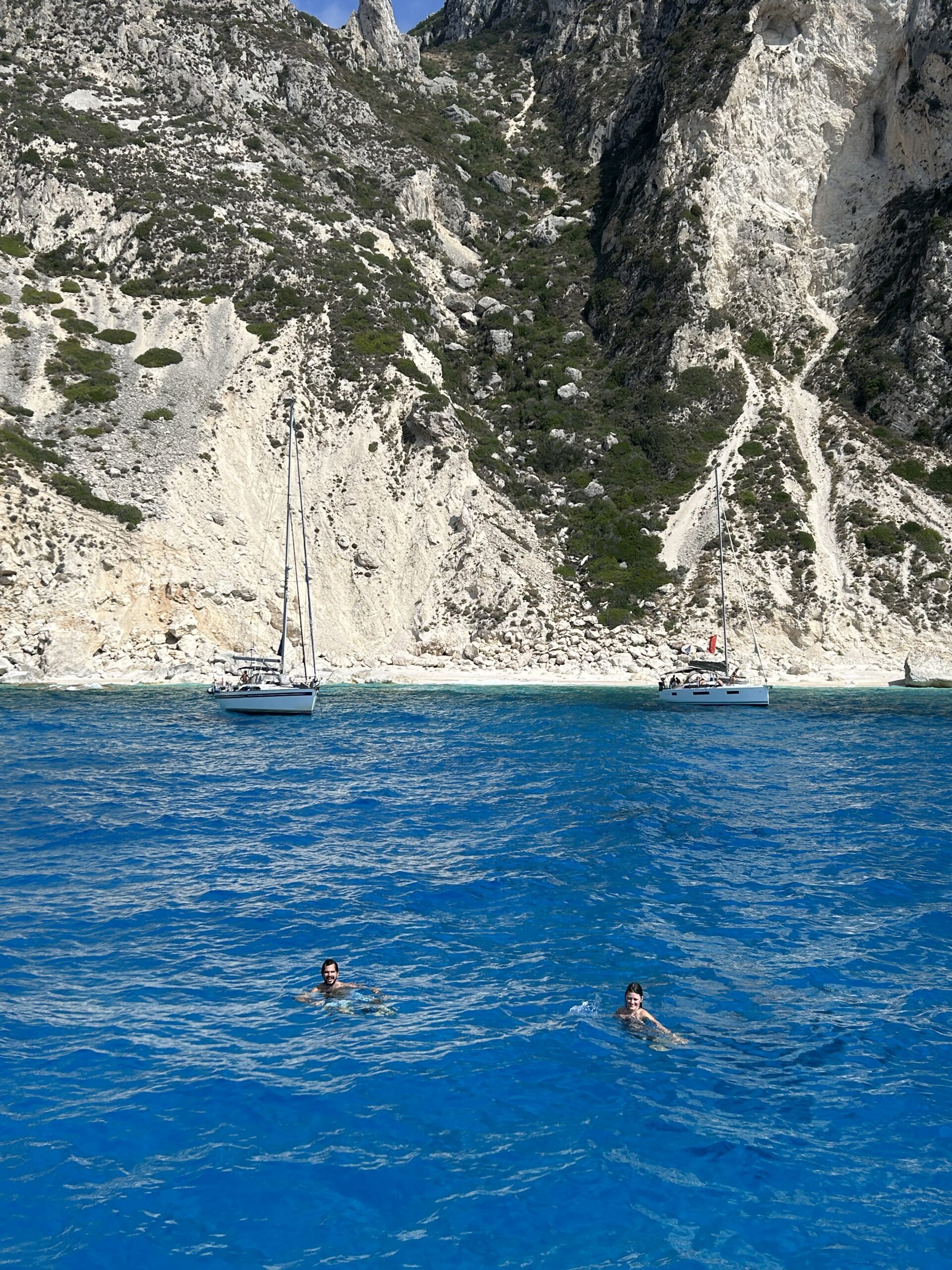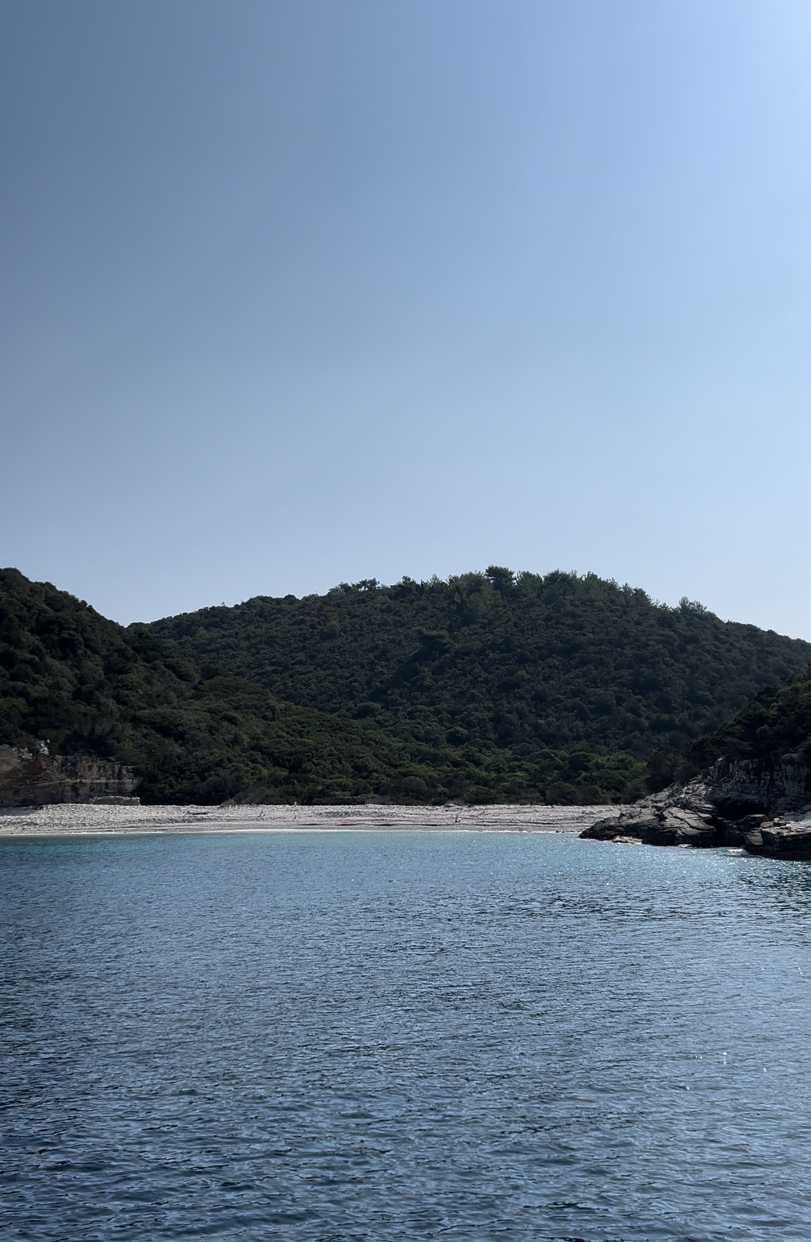Η Φτέρη, η επιβλητική παραλία με τα γαλαζοπράσινα νερά, τους λευκούς βράχους και την πλούσια βλάστηση, ήταν η πρώτη μας στάση για μπάνιο. Βουτώντας στα ανοιχτά της, ανάμεσα σε μικροσκοπικά ψαράκια και τους δικούς μου ανθρώπους, ένιωσα ελεύθερη. Έπειτα, από την πλώρη κοιτούσα με δέος το σκηνικό που μας φιλοξενούσε. Μακριά από ομπρελοκαθίσματα και συνωστισμό «αγκαλιαστήκαμε» με τη φύση και τη θαλάσσια ζωή.