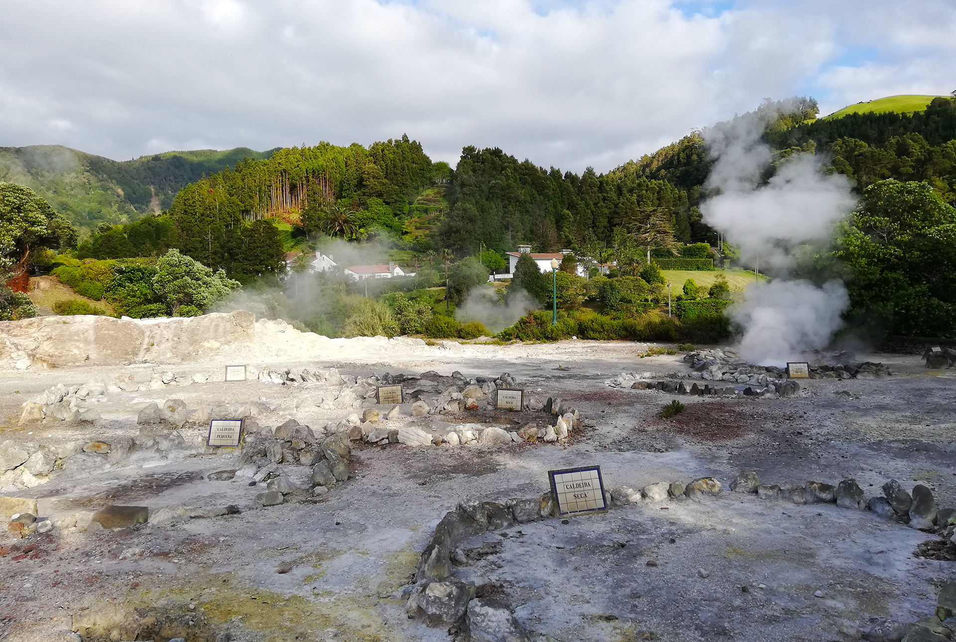 Η κοιλάδα που βρίσκεται το χωριό Furnas είναι στην πραγματικότητα ένας τεράστιος ηφαιστειακός κρατήρας. Παρ’ ότι το ηφαίστειο εξερράγη για τελευταία φορά το 1630, η ηφαιστειακή δραστηριότητα είναι έντονη στην περιοχή και οι κάτοικοι την εκμεταλλεύονται στο έπακρο. Υπάρχουν οι φυσικές ιαματικές πισίνες στην περιοχή, αλλά η ηφαιστειακή θερμότητα χρησιμοποιείται επίσης για το μαγείρεμα του Cozido, το παραδοσιακό φαγητό τους. Κατσαρόλες με μείγμα από διάφορα κρέατα και λαχανικά τοποθετούνται υπόγεια σε γεωθερμικές τρύπες που ονομάζονται Fumaroles και μένουν εκεί για περίπου 6 ώρες για να μαγειρευτούν με την ηφαιστειακή θερμότητα. Είναι μια ιδιαίτερη εμπειρία. Όπως και το να βλέπεις τους καπνούς να βγαίνουν από το χώμα. Ετοιμάσου για έντονη μυρωδιά από θειάφι.