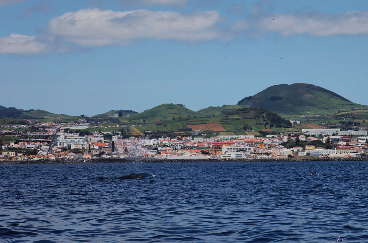 Η Ponta Delgada του São Miguel από το σκάφος παρατήρησης φαλαινών και δελφινιών και μία φάλαινα φυσητήρας ©ΓGM