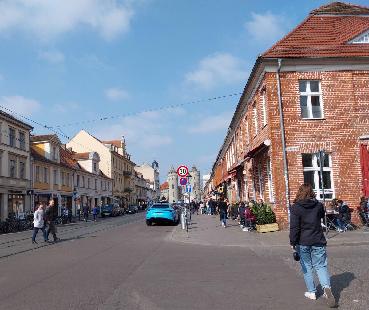 Στο βάθος του κεντρικού δρόμου Friedrich-Ebert strasse, η Πύλη Nauener. Από κάτω της περνάνε οι γραμμές του τραμ.