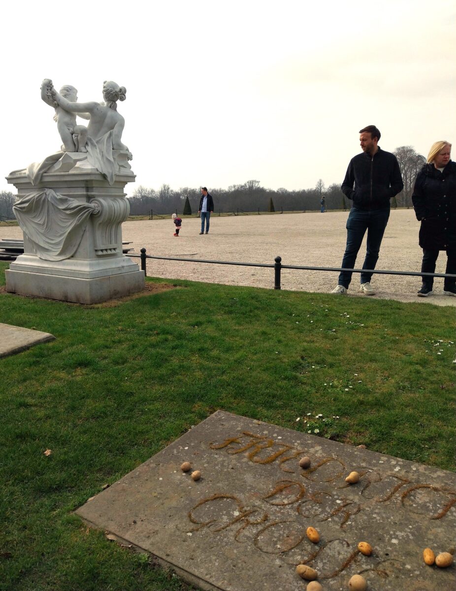 Εκεί βρίσκεται και ο τάφος του, στον οποίο τον ακολούθησαν τα 11 κυνηγετικά σκυλιά του –δεν έχω διευκρινίσει αν τα εκτέλεσαν αφού πέθανε για να τα θάψουν μαζί του ή αν τον ακολούθησαν ένα ένα όταν πέθαιναν με φυσικό θάνατο –εύχομαι το δεύτερο. Η ταφόπλακα είναι συχνά γεμάτη… πατάτες, καθώς ο βασιλιάς ήταν εκείνος που τις καθιέρωσε στην Πρωσία, γλυτώνοντας από την πείνα τον φτωχό λαό του –κι ακόμη τον τιμούν για αυτό οι ντόπιοι επισκέπτες.