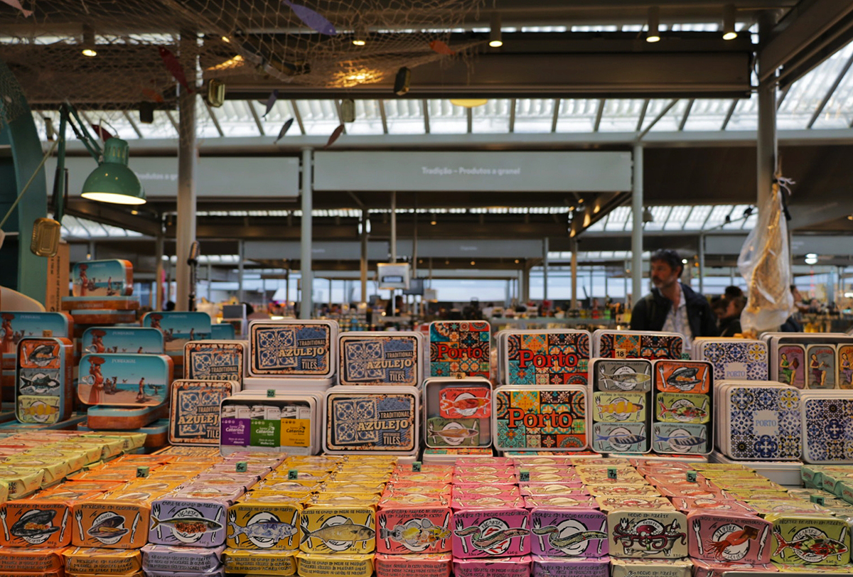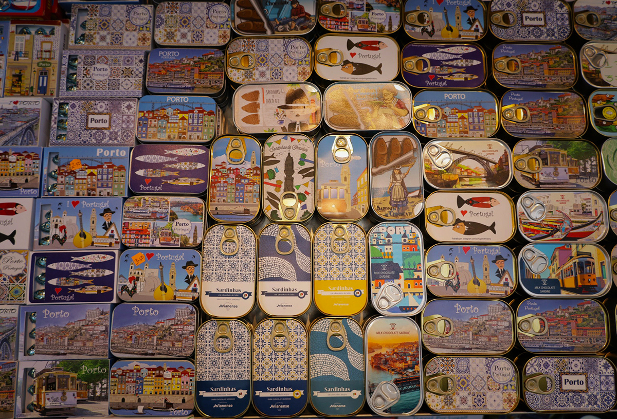 Κάποια από αυτά τα κουτιά στο Mercado do Bolhão δεν έχουν σαρδέλες αλλά σοκολατάκια σε σχήμα σαρδέλας. ©ΓGΜ