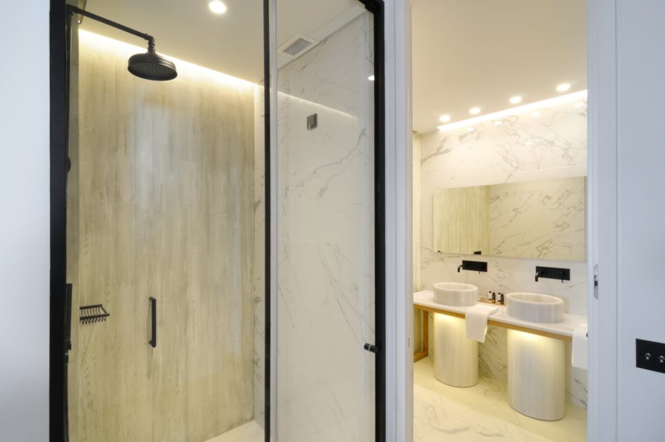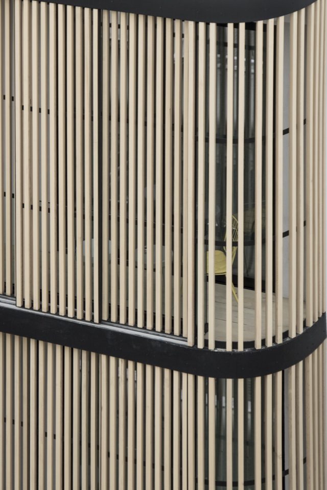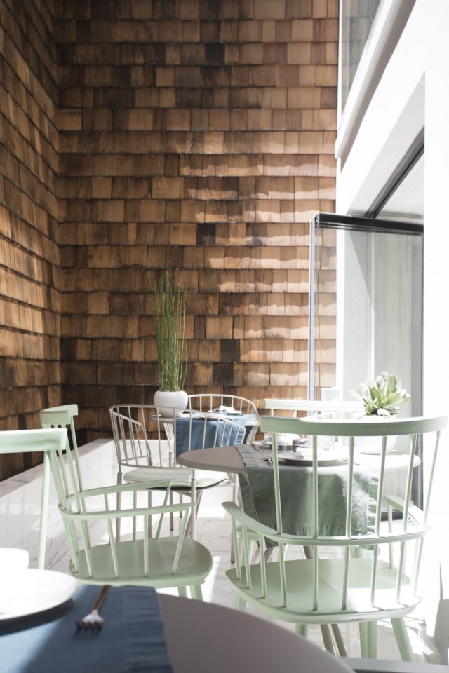 Περπατώντας λοιπόν στον δρόμο του Κολωνακίου, είναι αδύνατο να μην προσέξετε την εμφάνιση του ξενοδοχείου που, εκτός από καλαίσθητη, είναι λειτουργική. «Ιδιαίτερη προσοχή δόθηκε επίσης στις συρόμενες, ξύλινες περσίδες που αναρτώνται από την πλάκα του εκάστοτε υπάρχοντος εξώστη, ακολουθώντας και σηματοδοτώντας παράλληλα το περίγραμμά του. Οι κινητές περσίδες εξυπηρετούν τη σκίαση των δωματίων και εξασφαλίζουν την ιδιωτικότητα των ενοίκων, αφού κατ’ επιλογή μπορούν να τις σύρουν κατά μήκος των εξωστών στο επιθυμητό σημείο. Αντίστοιχα στο καμπύλο, υπάρχον πλαϊνό τμήμα του εξώστη στοιχίζονται σταθερές περσίδες, όμοιες με τις κινητές, οι οποίες περιγράφουν την αρχική καμπύλη μορφή των εξωστών. Η ξυλεία που επιλέχθηκε είναι ισόβενος κέδρος Βόρειας Αμερικής λόγω του ήπιου χρωματισμού και της ανθεκτικότητας που παρουσιάζει στην ατμοσφαιρική ρύπανση, ακολουθώντας ταυτόχρονα τη φιλοσοφία της εταιρείας Coco-Mat για φυσικά και οικολογικά υλικά.».