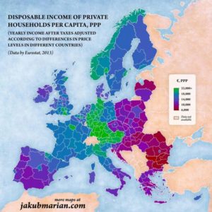 Ο χαρτογράφoς Jacub Marian μόλις σχημάτισε έναν χάρτη με τις πλουσιότερες χώρες της Ευρώπης. Τα δεδομένα έχουν βασιστεί στις εκτιμήσεις της Credit Suisse, μιας υπηρεσίας με έδρα την Ελβετία, η οποία τα δημοσιεύει κάθε χρόνο. Η Credit Suisse μετρά τον πλούτο προσθέτοντας την αξία των χρηματοοικονομικών περιουσιακών στοιχείων και των μη χρηματοπιστωτικών περιουσιακών στοιχείων και στη συνέχεια αφαιρεί το χρέος.
